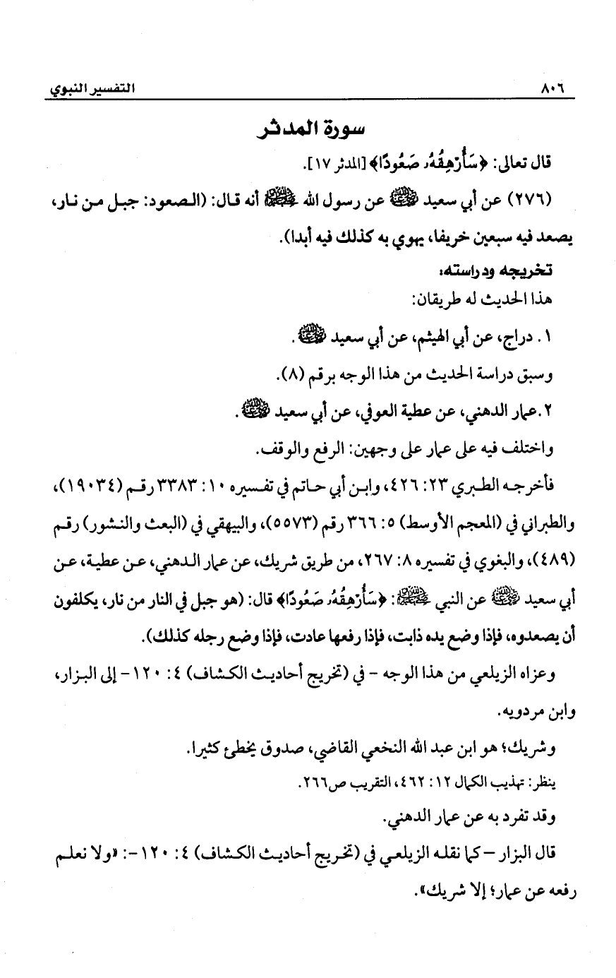 فأخرجه الطبري 23: 426، وابن أبى حاتم في تفسيره 15: 3383 رقم (19034)، والطبرانى في (المعجم الأوسط) 5: 366 رقم (5573)، والبيهقي في (البعث والنشور) رقم (489)، والبغوي في تفسيره 8: 267، من طريق شريك، عن عمار الدهني، عن عطية، عن أبي سعيد -رضي الله عنه- عن النبي -صلى الله عليه وسلم-: {سَأُرْهِقُهُ صَعُودًا} قال: (هو جبل في النار من نار، يكلفون أن يصعدوه، فإذا وضع يده ذابت، فإذا رفعها عادت، فإذا وضع رجله كذلك).