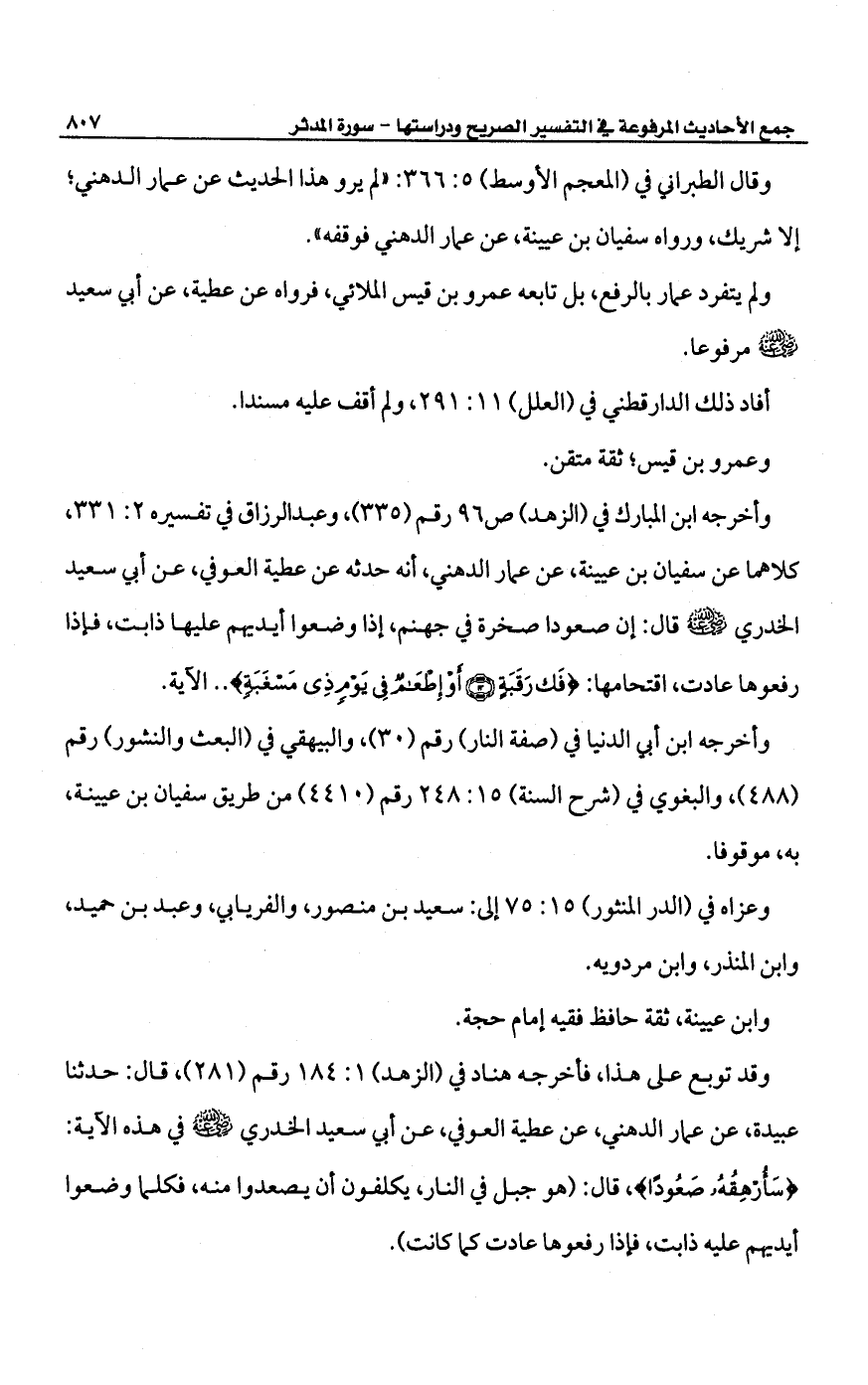 وقد توبع على هذا، فأخرجه هناد في (الزهد) 1: 184 رقم (281)، قال: حدثنا عبيدة، عن عمار الدهني، عن عطية العوفي، عن أبى سعيد الخدري -رضي الله عنه- في هذه الآية: {سَأرهِقُهُ صَعُوداً}، قال: (هو جبل في النار، يكلفون أن يصعدوا منه، فكلما وضعوا أيديهم عليه ذابت، فإذا رفعوها عادت كما كانت).