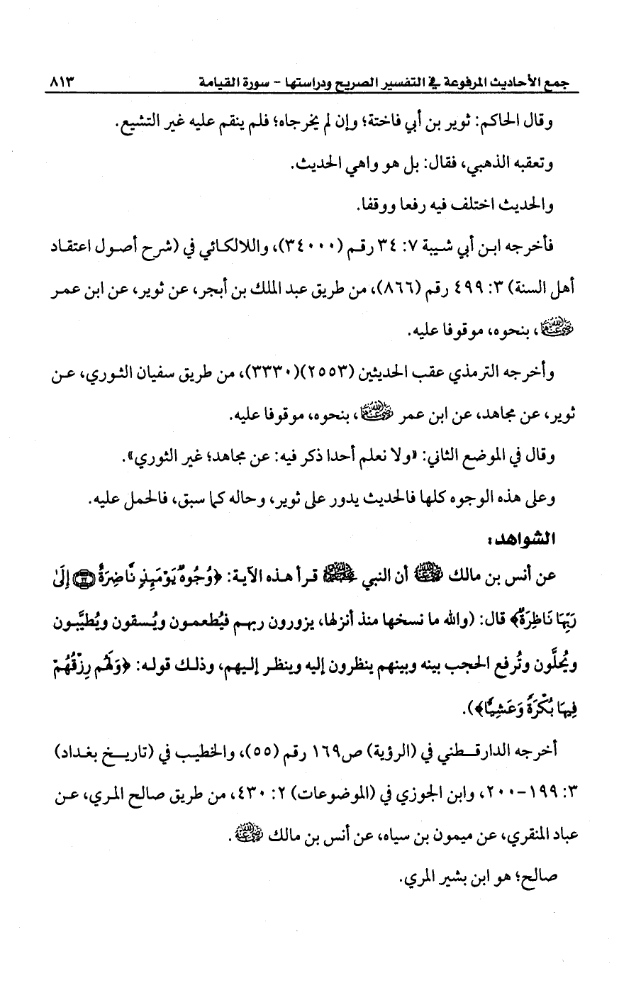 عن أنس بن مالك -رضي الله عنه- أن النبي -صلى الله عليه وسلم- قرأ هذه الآية: {وُجُوهٌ يَوْمَئِذٍ نَاضِرَةٌ (22) إِلَى رَبِّهَا نَاظِرَةٌ}. قال: (والله ما نسخها منذ أنزلها، يزورون ربهم فيُطعمون ويُسقون ويُطيَّبون ويُحلَّون وتُرفع الحجب بينه وبينهم ينظرون إليه وينظر إليهم، وذلك قوله: {وَلَهُمْ رِزْقُهُمْ فِيهَا بُكْرَةً وَعَشِيًّا}).