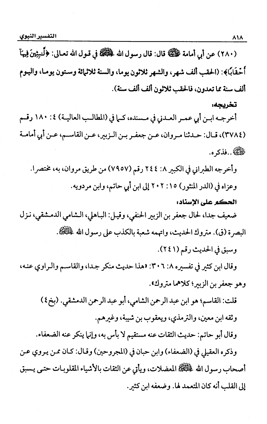 (280) عن أبى أمامة -رضي الله عنه- قال: قال رسول الله -صلى الله عليه وسلم- في قول الله تعالى: {لَابِثِينَ فِيهَا أَحْقَابًا}: (الحقب ألف شهر، والشهر ثلاثون يوما، والسنة ثلاثمائة وستون يوما، واليوم ألف سنة مما تعدون، فالحقب ثلاثون ألف ألف سنة).