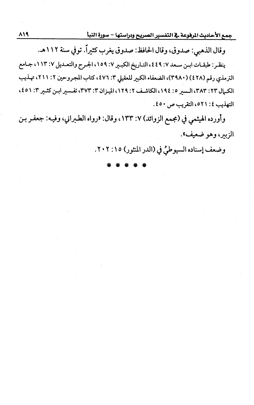 ينظر: طبقات ابن سعد 7: 449، التاريخ الكبير 7: 159، الجرح والتعديل 7: 113، جامع الترمذى رقم (428) (3980)، الضعفاء الكبير للعقيلي 3: 476، كتاب المجروحين 2: 211، تهذيب الكمال 23: 383، السير 5: 194، الكاشف 2: 129، الميزان 3: 373، تفسير ابن كثير 3: 451، التهذيب 4: 521، التقريب ص 450.