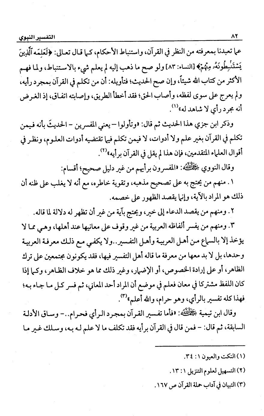 وقال النووي -رحمه الله-:"المفسرون برأيهم من غير دليل صحيح؛ أقسام: