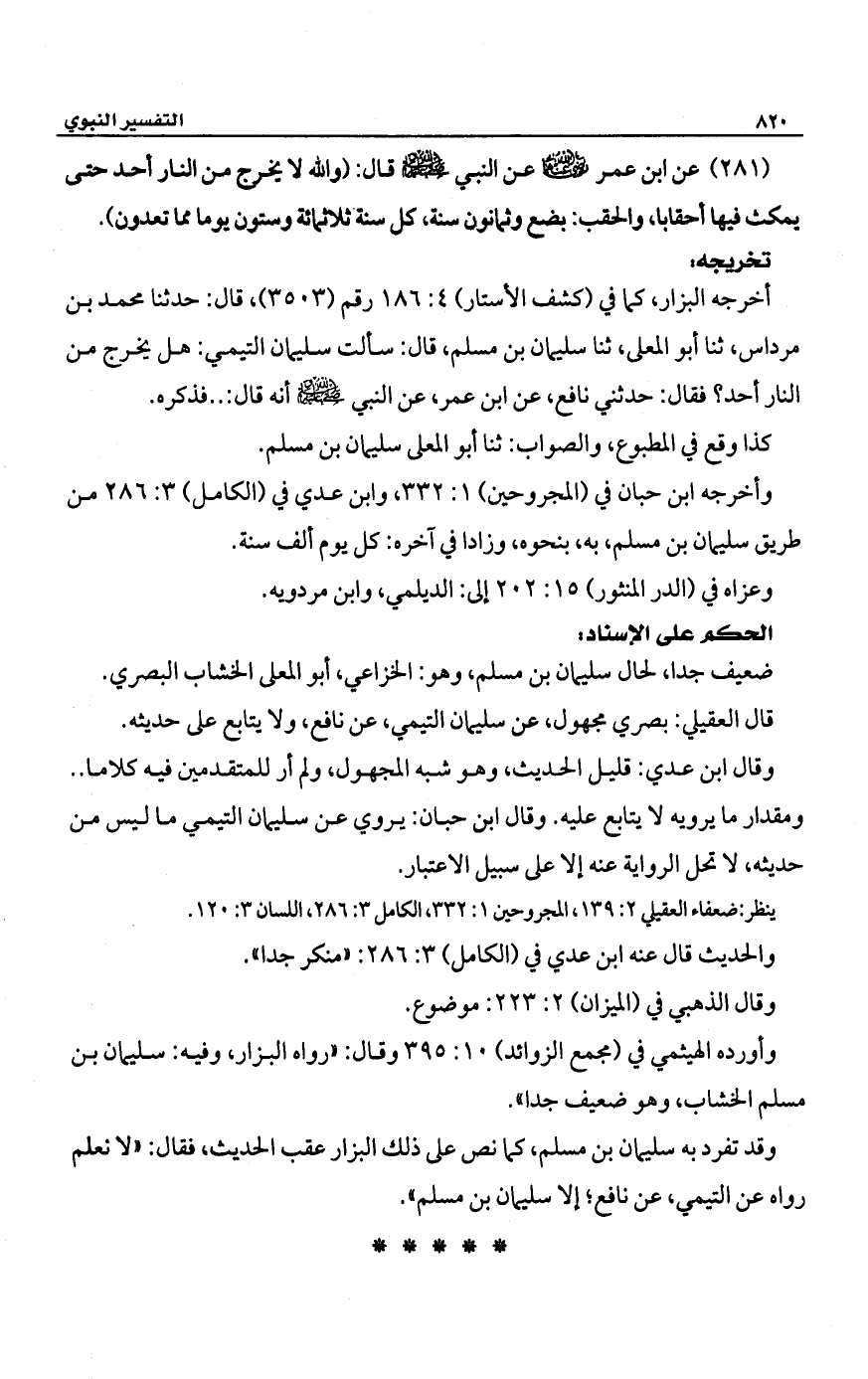 (281) عن ابن عمر -رضي الله عنهما- عن النبي -صلى الله عليه وسلم- قال: (والله لا يخرج من النار أحد حتى يمكث فيها أحقابا، والحقب: بضع وثمانون سنة، كل سنة ثلاثمائة وستون يوما مما تعدون).