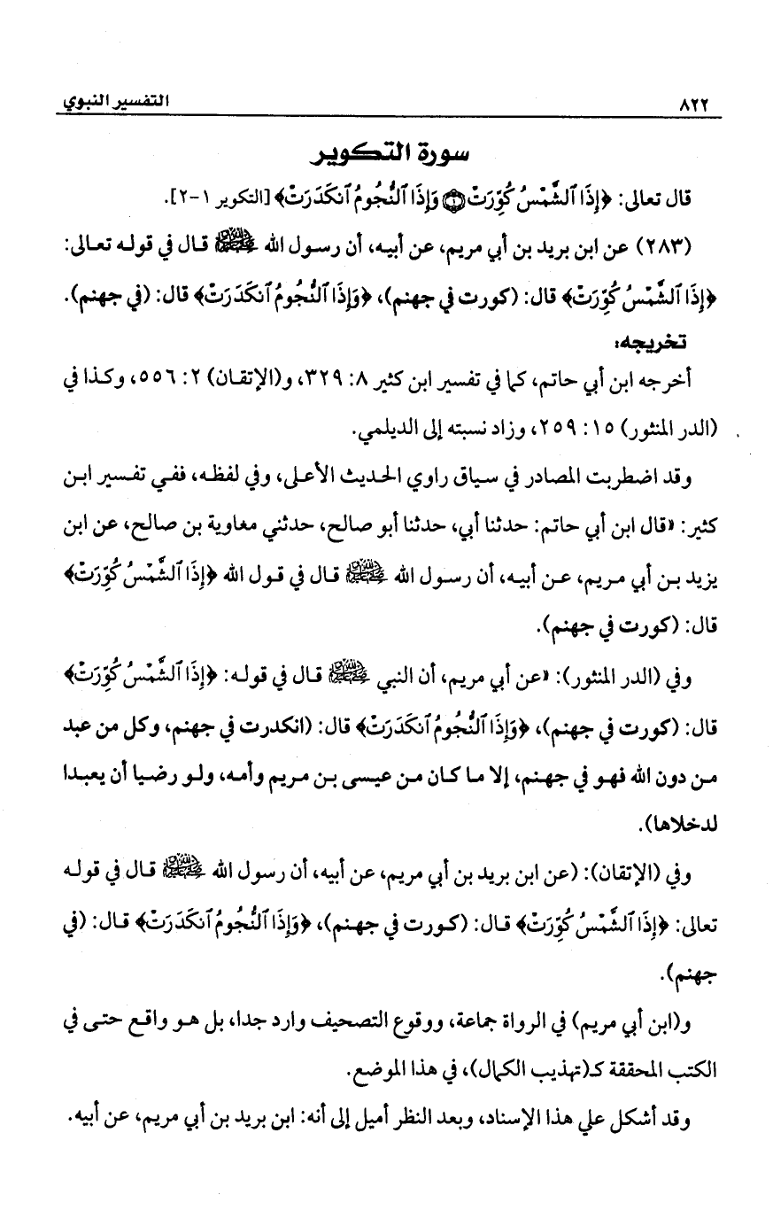 وفي (الإتقان): (عن ابن بريد بن أبي مريم، عن أبيه، أن رسول الله -صلى الله عليه وسلم- قال في قوله تعالى: {إِذَا الشَّمْسُ كُوِّرَتْ} قال: (كورت في جهنم)، {وَإِذَا النُّجُومُ انْكَدَرَتْ} قال: (في جهنم).
