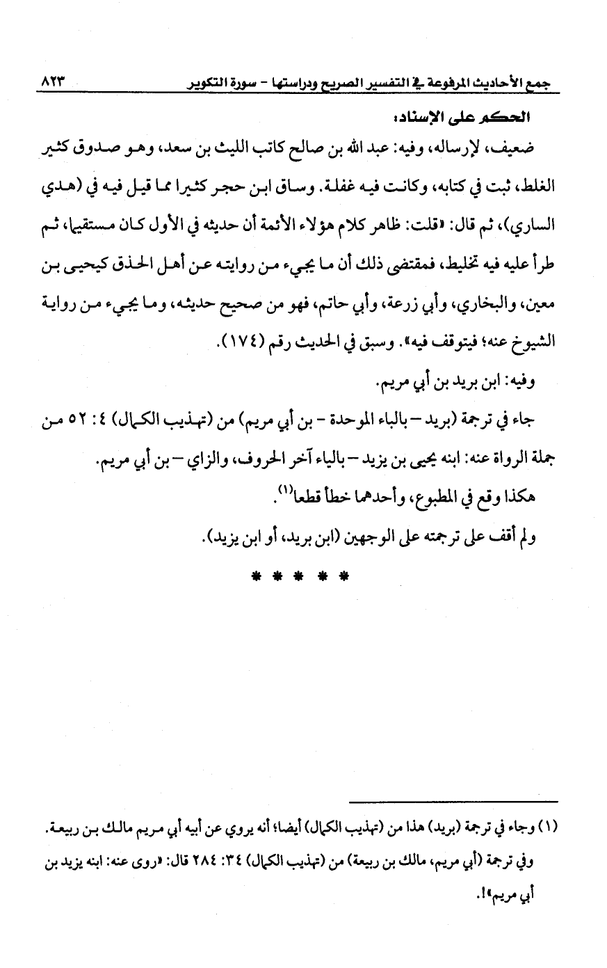 (¬1) وجاء في ترجمة (بريد) هذا من (تهذيب الكمال) أيضا؛ أنه يروي عن أبيه أبي مريم مالك بن ربيعة. وفي ترجمة (أبي مريم، مالك بن ربيعة) من (تهذيب الكمال) 34: 284 قال: "روى عنه: ابنه يزيد بن أبى مريم"!.