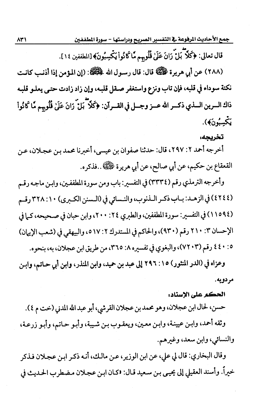 وأخرجه الترمذي رقم (3334) في التفسير: باب ومن سورة المطففين، وابن ماجه رقم (4244) في الزهد: باب ذكر الذنوب، والنسائي في (السنن الكبرى) 10: 328 رقم (11594) في التفسير: سورة المطففين، والطبري 24: 200، وابن حبان في صحيحه، كما في الإحسان 3: 210 رقم (930)، والحاكم في المستدرك 2: 517، والبيهقي في (شعب الإيمان) 5: 440 رقم (7203)، والبغوي في تفسيره 365:8، من طريق ابن عجلان، به، بنحوه.
