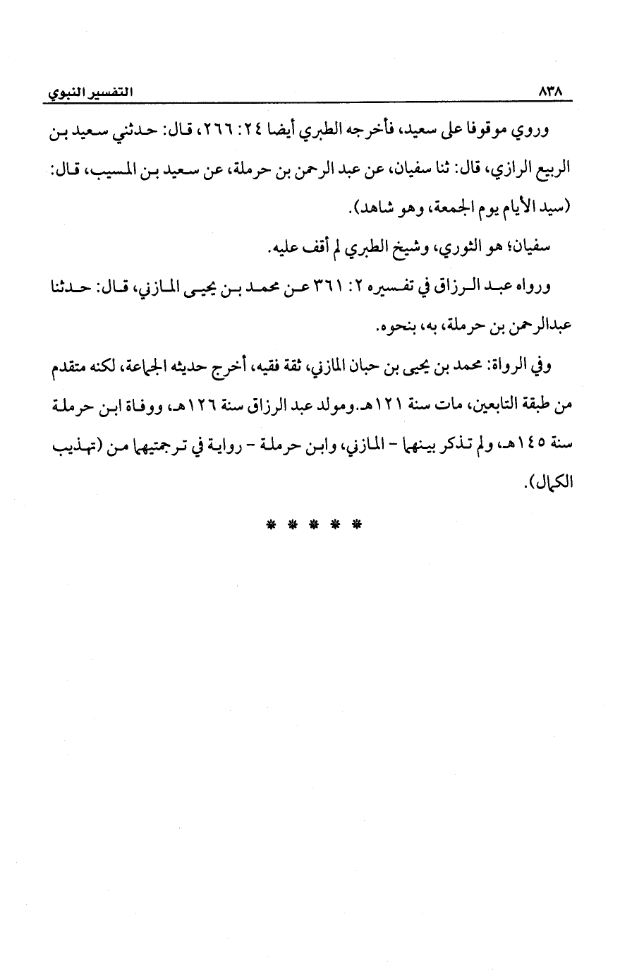 وروي موقوفا على سعيد، فأخرجه الطبري أيضا 24: 266، قال: حدثني سعيد بن الربيع الرازي، قال: ثنا سفيان، عن عبد الرحمن بن حرملة, عن سعيد بن السيب، قال: (سيد الأيام يوم الجمعة، وهو شاهد).