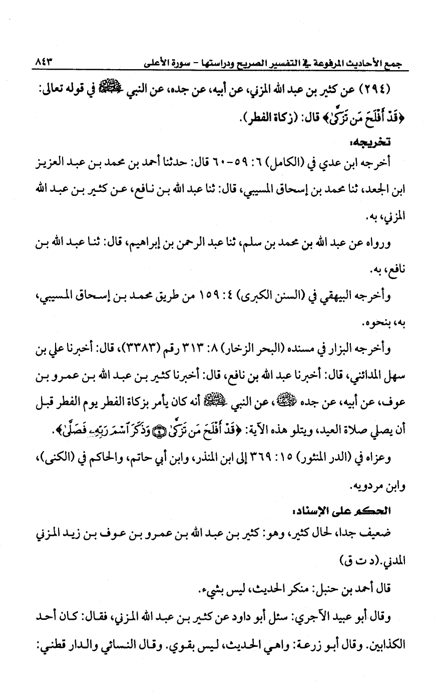 (294) عن كثير بن عبد الله المزني، عن أبيه، عن جده، عن النبي -صلى الله عليه وسلم- في قوله تعالى: {قَدْ أَفْلَحَ مَنْ تَزَكَّى} قال: (زكاة الفطر).