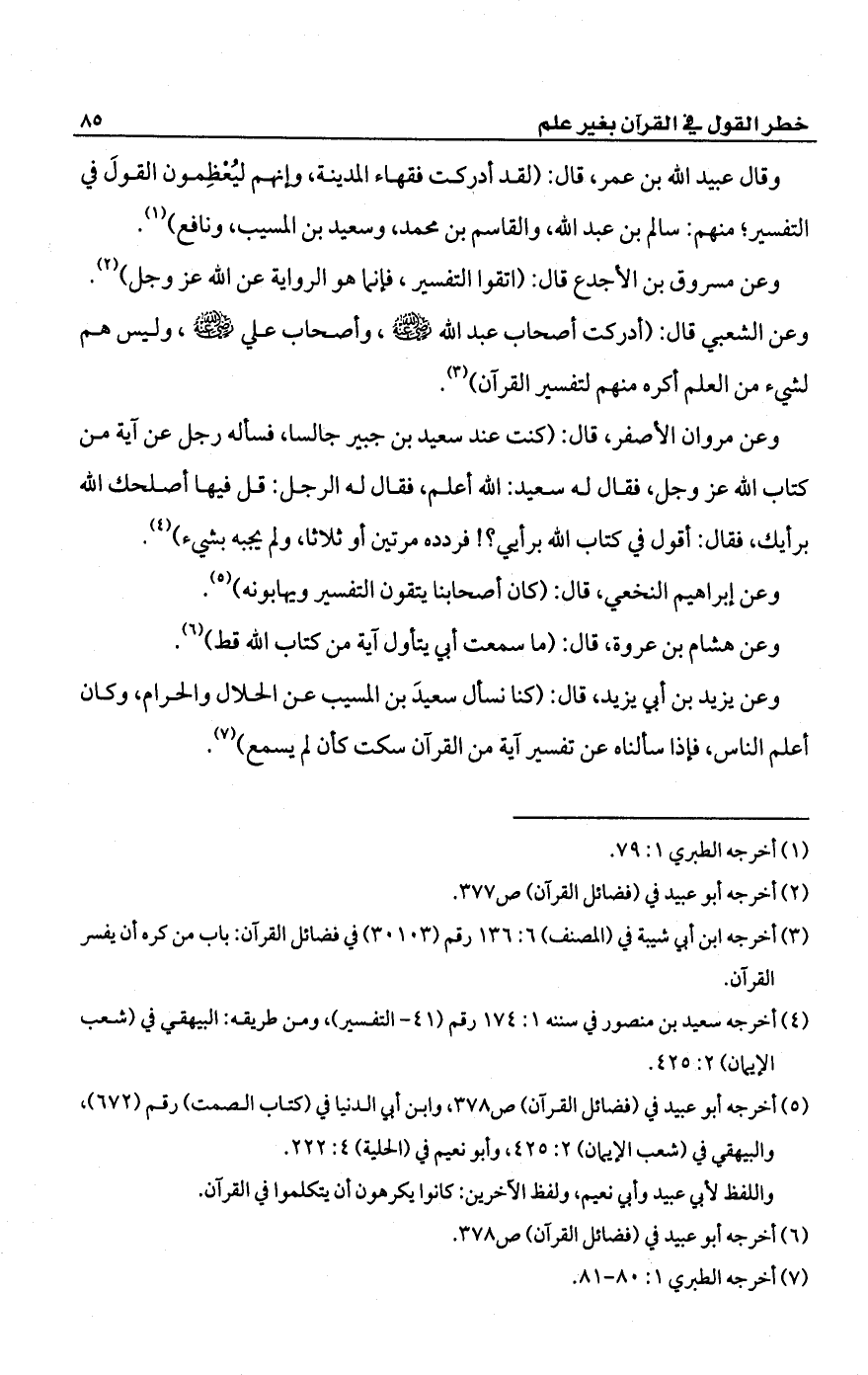 (¬5) أخرجه أبو عبيد في (فضائل القرآن) ص 378، وابن أبي الدنيا في (كتاب الصمت) رقم (672)، والبيهقي في (شعب الإيمان) 2: 425، وأبو نعيم في (الحلية) 4: 222.