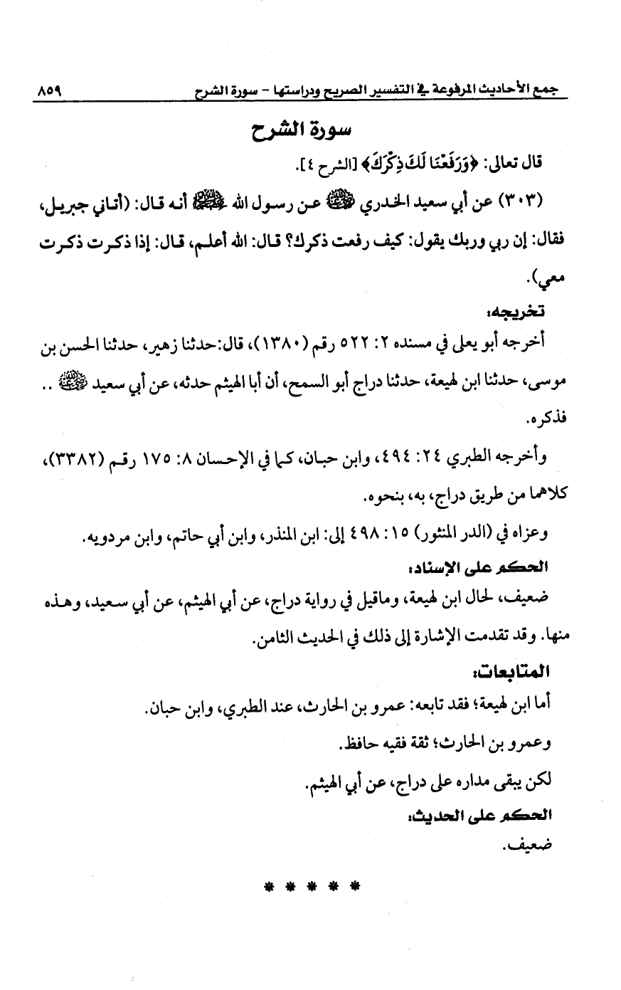 (303) عن أبي سعيد الخدري -رضي الله عنه- عن رسول الله -صلى الله عليه وسلم- أنه قال: (أتانى جبريل، فقال: إن ربى وربك يقول: كيف رفعت ذكرك؟ قال: الله أعلم، قال: إذا ذكرت ذكرت معي).