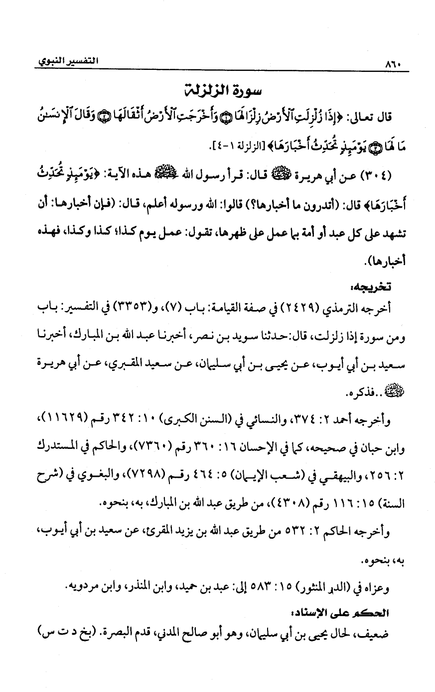 (304) عن أبي هريرة -رضي الله عنه- قال: قرأ رسول الله -صلى الله عليه وسلم - هذه الآية: {يَوْمَئِذٍ تُحَدِّثُ أَخْبَارَهَا} قال: (أتدرون ما أخبارها؟) قالوا: الله ورسوله أعلم، قال: (فإن أخبارها: أن تشهد على كل عبد أو أمة بما عمل على ظهرها، تقول: عمل يوم كذا؛ كذا وكذا، فهذه أخبارها).