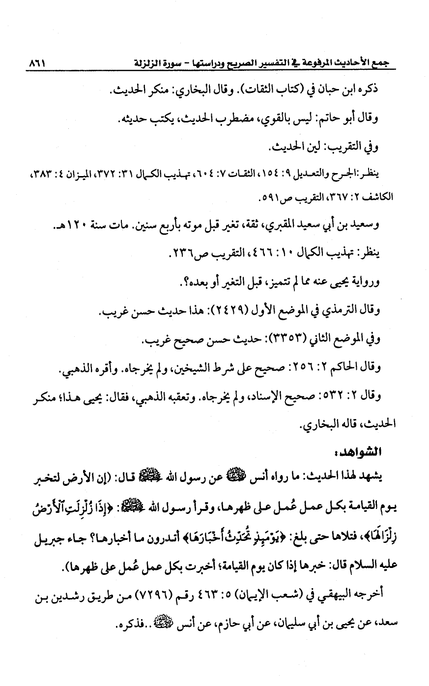 يشهد لهذا الحديث: ما رواه أنس -رضي الله عنه- عن رسول الله -صلى الله عليه وسلم- قال: (إن الأرض لتخبر يوم القيامة بكل عمل عُمل على ظهرها، وقرأ رسول الله -صلى الله عليه وسلم-: {إِذَا زُلْزِلَتِ الْأَرْضُ زِلْزَالَهَا}، فتلاها حتى بلغ: {يَوْمَئِذٍ تُحَدِّثُ أَخْبَارَهَا} أتدرون ما أخبارها؟ جاء جبربل عليه السلام قال: خبرها إذا كان يوم القيامة؛ أخبرت بكل عمل عُمل على ظهرها).
