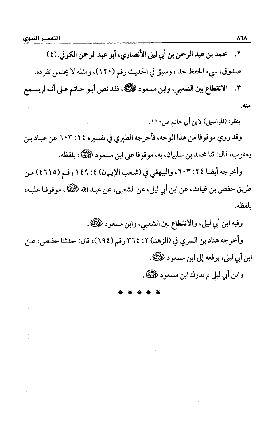 3 - الانقطاع بين الشعبي، وابن مسعود -رضي الله عنه-، فقد نص أبو حاتم على أنه لم يسمع منه.