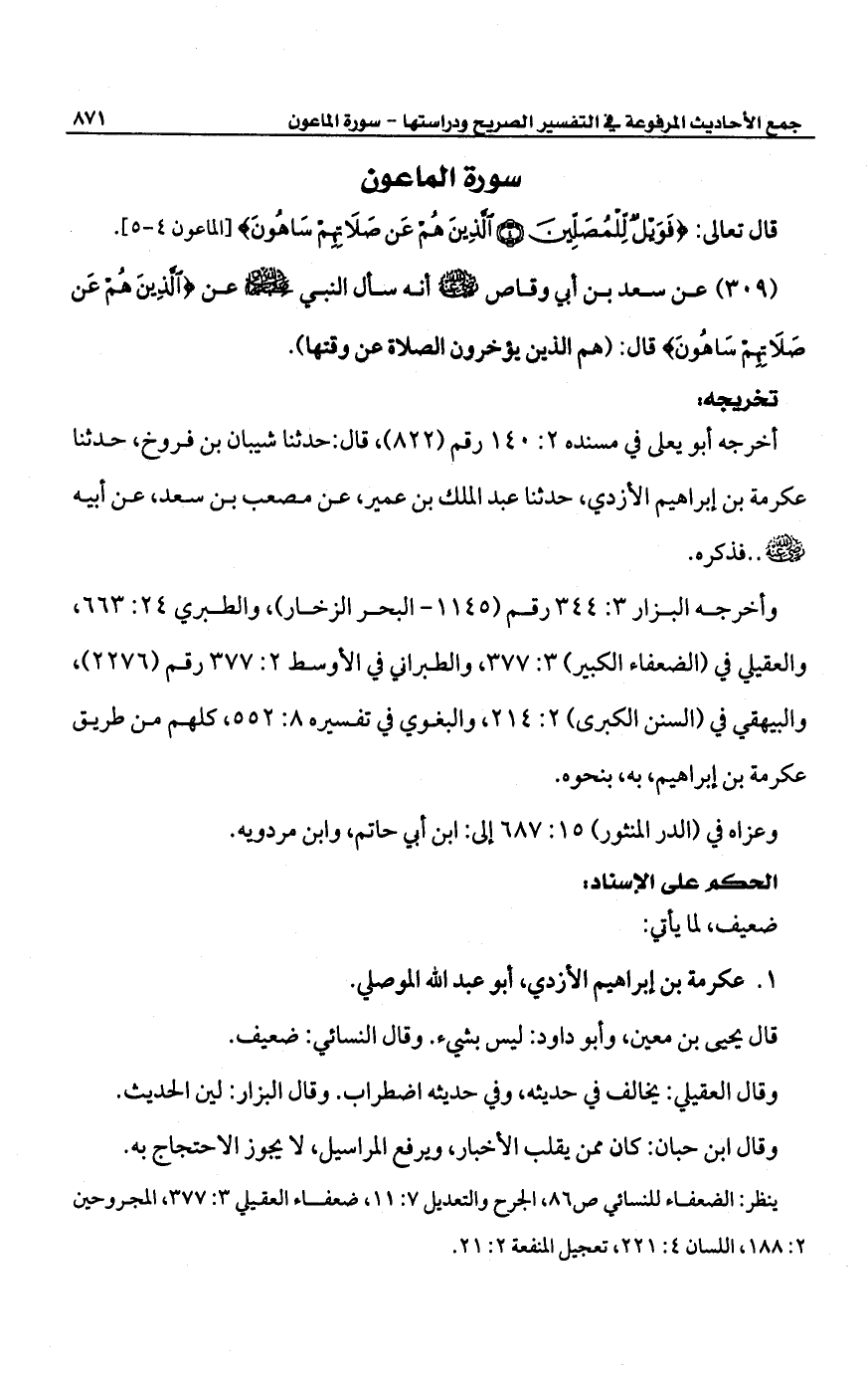 (309) عن سعد بن أبي وقاص -رضي الله عنه- أنه سأل النبى -صلى الله عليه وسلم- عن {الَّذِينَ هُمْ عَنْ صَلَاتِهِمْ سَاهُونَ} قال: (هم الذين يؤخرون الصلاة عن وقتها).
