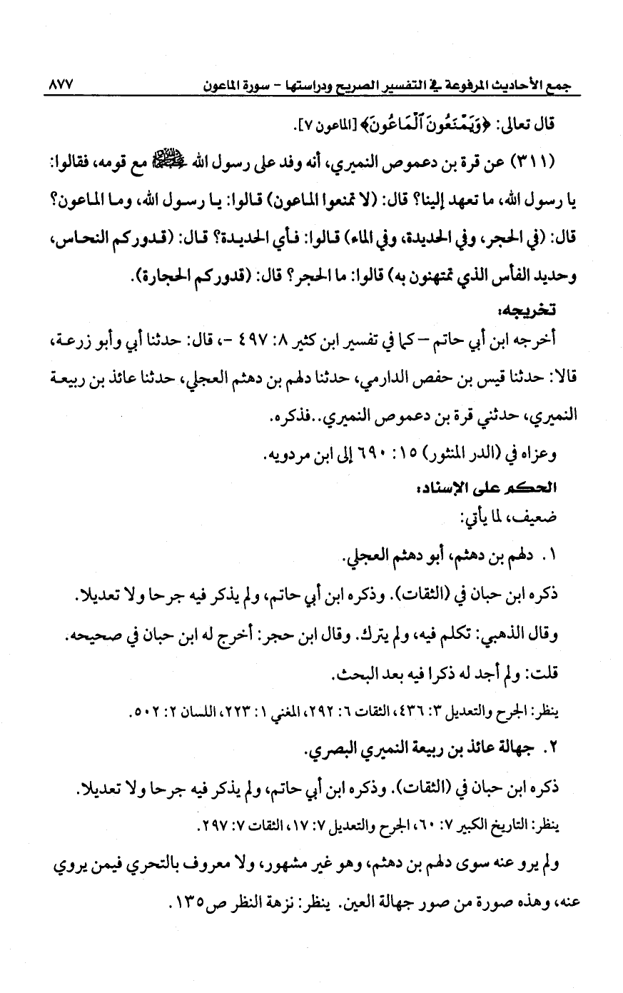 أخرجه ابن أبي حاتم -كما في تفسير ابن كثير 8: 497 - ، قال: حدثنا أبي وأبو زرعة, قالا: حدثنا قيس بن حفص الدارمي، حدثنا دلهم بن دهشم العجلي، حدثنا عائذ بن ربيعة النميري، حدثني قرة بن دعموص النميري .. فذكره.