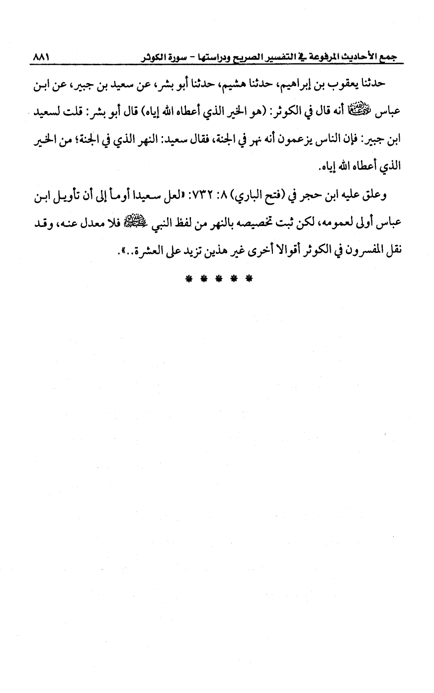 حدثنا يعقوب بن إبراهيم، حدثنا هشيم، حدثنا أبو بشر، عن سعيد بن جبير، عن ابن عباس -رضي الله عنهما- أنه قال في الكوثر: (هو الخير الذي أعطاه الله إياه) قال أبو بشر: قلت لسعيد. ابن جبير: فإن الناس يزعمون أنه نهر في الجنة، فقال سعيد: النهر الذي في الجنة؛ من الخير الذي أعطاه الله إياه.