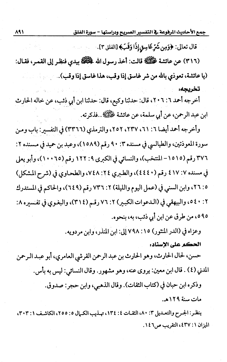 (316) عن عائشة -رضي الله عنها- قالت: أخذ رسول الله -صلى الله عليه وسلم- بيدي فنظر إلى القمر، فقال: (يا عائشة، تعوذي بالله من شر غاسق إذا وقب, هذا غاسق إذا وقب).