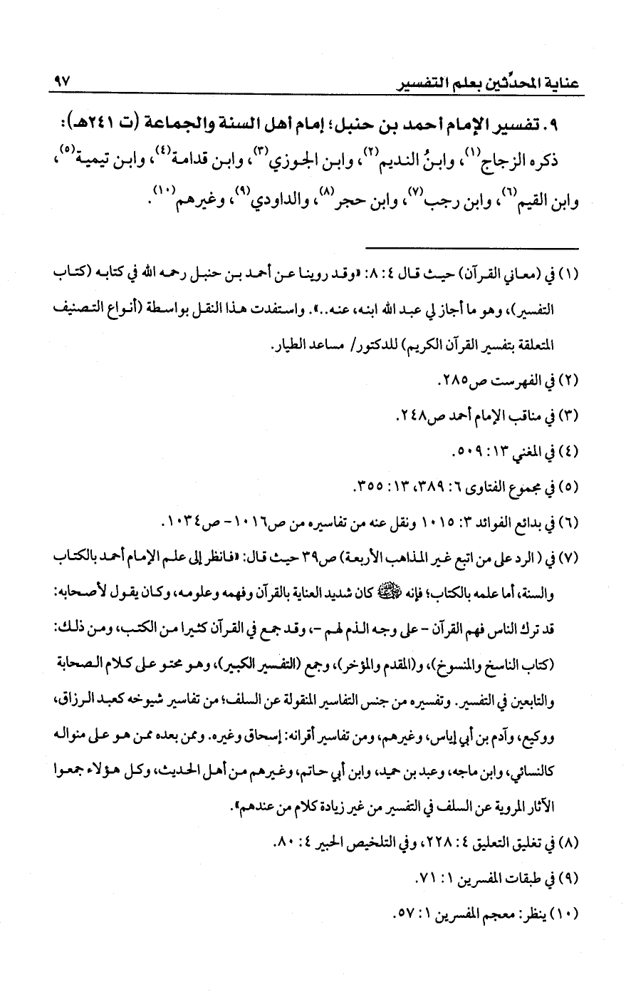 (¬7) في (الرد على من اتبع غير المذاهب الأربعة) ص 39 حيث قال: "فانظر إلى علم الإمام أحمد بالكتاب والسنة، أما علمه بالكتاب؛ فإنه -رضي الله عنه- كان شديد العناية بالقرآن وفهمه وعلومه، وكان يقول لأصحابه: قد ترك الناس فهم القرآن -على وجه الذم لهم- وقد جمع في القرآن كثيرا من الكتب، ومن ذلك: (كتاب الناسخ والمنسوخ)، و (المقدم والمؤخر)، وجمع (التفسير الكبير)، وهو محتو على كلام الصحابة والتابعين في التفسير. وتفسيره من جنس التفاسير المنقولة عن السلف؛ من تفاسير شيوخه كعبد الرزاق، ووكيع، وآدم بن أبي إياس، وغيرهم، ومن تفاسير أقرانه: إسحاق وغيره. وممن بعده ممن هو على منواله كالنسائى، وابن ماجه، وعبد بن حمد، وابن أبي حاتم، وغيرهم من أهل الحديث، وكل هؤلاء جمعوا الآثار المروية عن السلف في التفسير من غير زيادة كلام من عندهم".