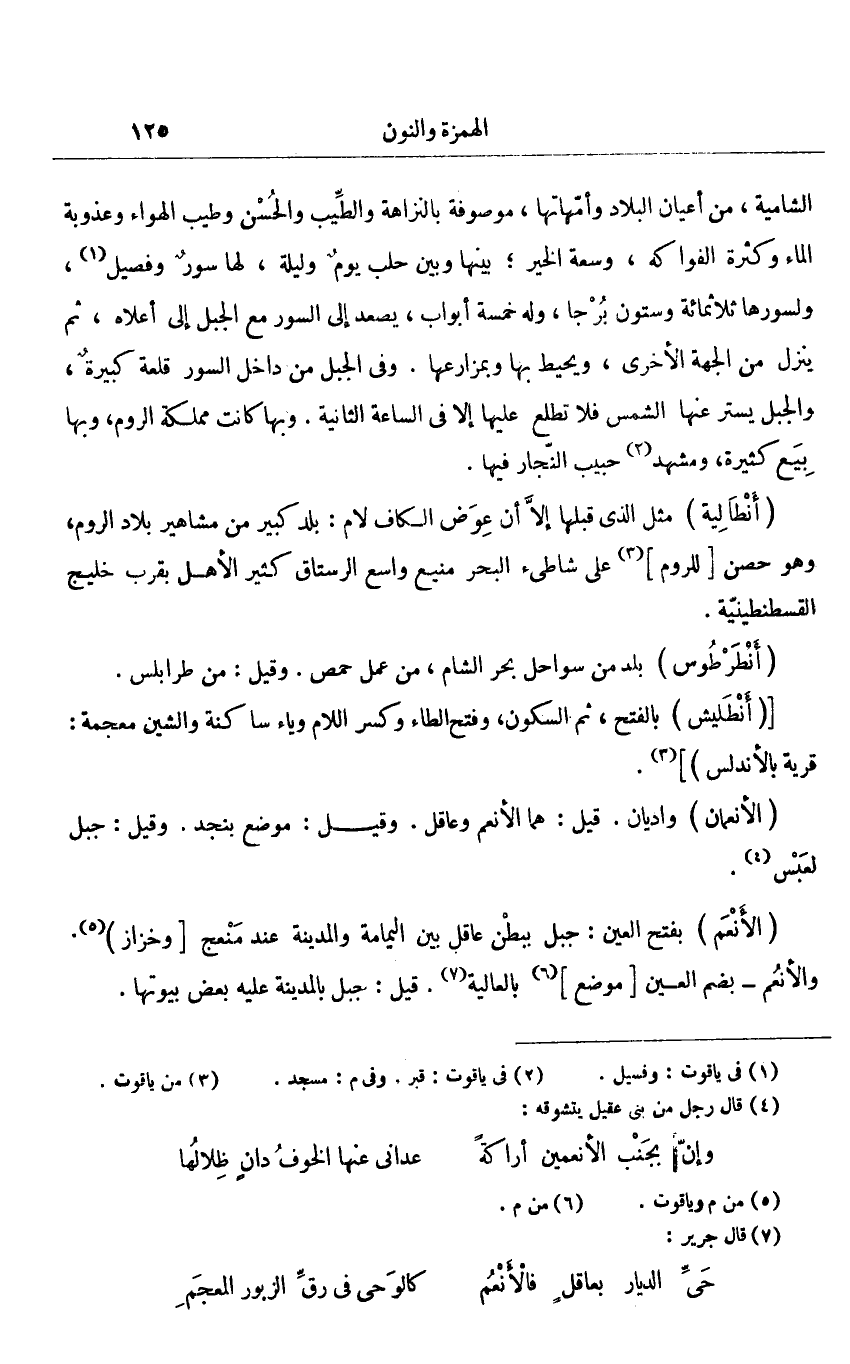 الشامية، من أعيان البلاد وأمّهاتها، موصوفة بالنزاهة والطّيب والحسن وطيب الهواء وعذوبة الماء وكثرة الفواكه، وسعة الخير؛ بينها وبين حلب يوم وليلة، لها سور وفصيل «1» ، ولسورها ثلاثمائة وستون برجا، وله خمسة أبواب، يصعد إلى السور مع الجبل إلى أعلاه، ثم ينزل من الجهة الأخرى، ويحيط بها وبمزارعها. وفى الجبل من داخل السور قلعة كبيرة، والجبل يستر عنها الشمس فلا تطلع عليها إلا فى الساعة الثانية. وبها كانت مملكة الروم، وبها بيع كثيرة، ومشهد «2» حبيب النّجار فيها.