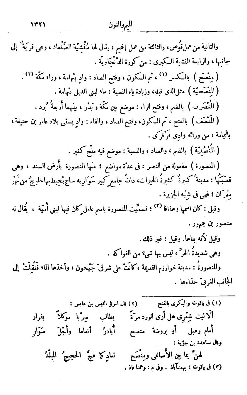 مفعولة من النصر: فى عدّة مواضع؛ منها المنصورة بأرض السند، وهى قصبتها: مدينة كبيرة كثيرة الخيرات، ذات جامع كبير سواريه ساج يحيط بها خليج من نهر مهران؛ فهى فى شبه الجزيرة.