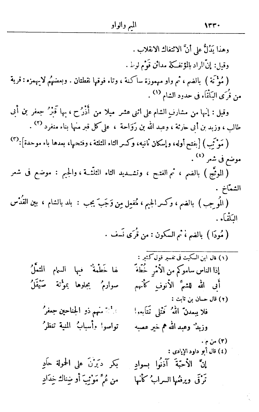 وقيل: إنها من مشارف الشام على اثنى عشر ميلا من أذرح، بها قبر جعفر بن أبى طالب، وزيد بن حارثة، وعبد الله بن رواحة، على كل قبر منها بناء منفرد «2» .