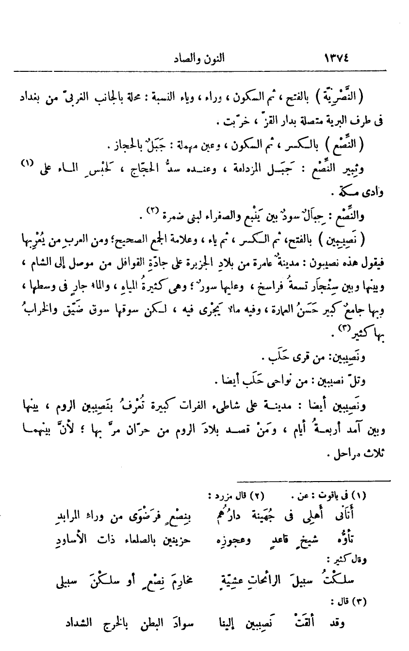 بالفتح، ثم الكسر، ثم ياء، وعلامة الجمع الصحيح؛ ومن العرب من يعربها فيقول هذه نصيبون: مدينة عامرة من بلاد الجزيرة على جادّة القوافل من موصل إلى الشام، وبينها وبين سنجار تسعة فراسخ، وعليها سور؛ وهى كثيرة المياه، والماء جار فى وسطها، وبها جامع كبير حسن العمارة، وفيه ماء يجرى فيه، لكن سوقها سوق ضيّق والخراب بها كثير «3» .