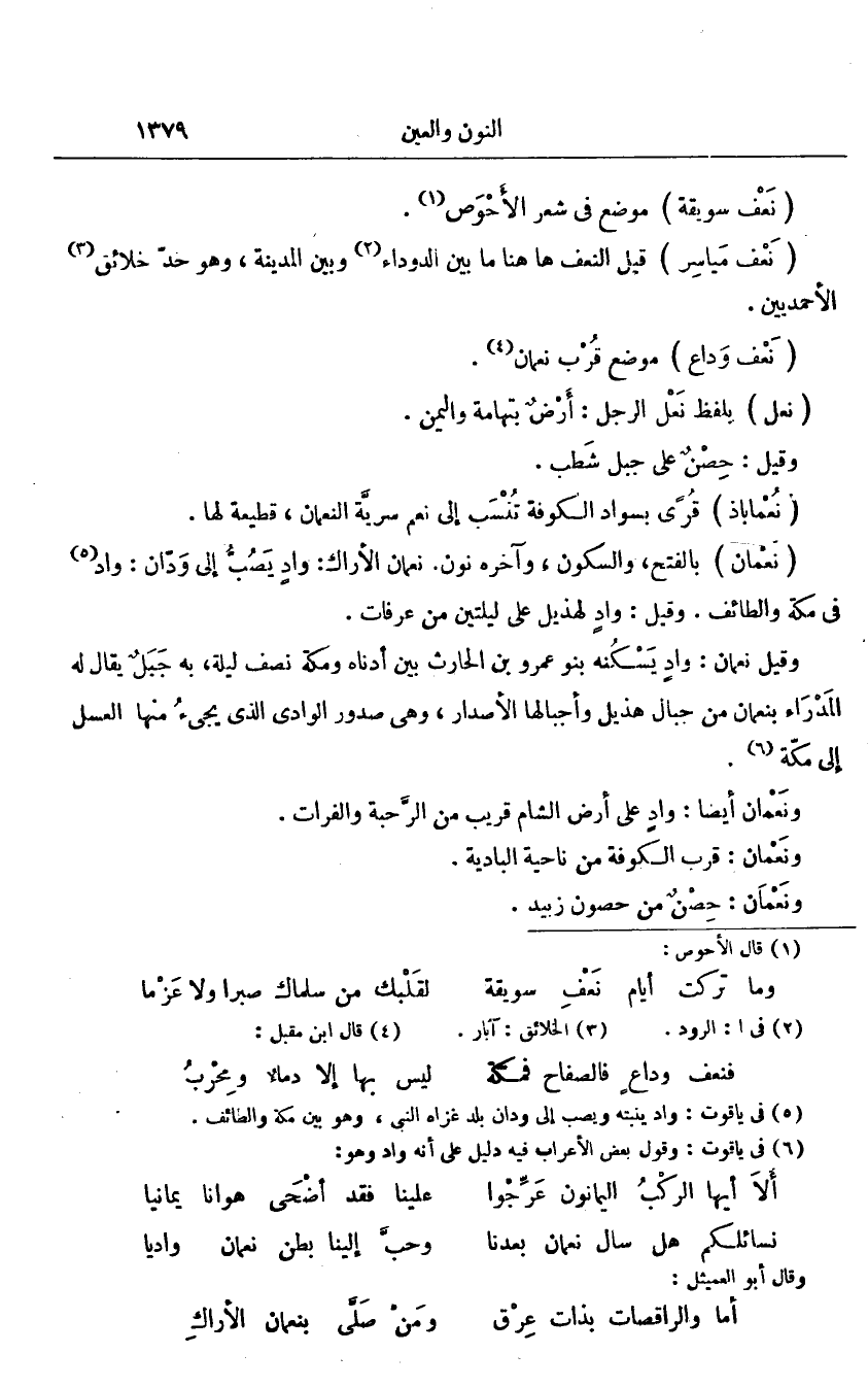 بالفتح، والسكون، وآخره نون. نعمان الأراك: واد يصبّ إلى ودّان: واد «5» فى مكة والطائف. وقيل: واد لهذيل على ليلتين من عرفات.