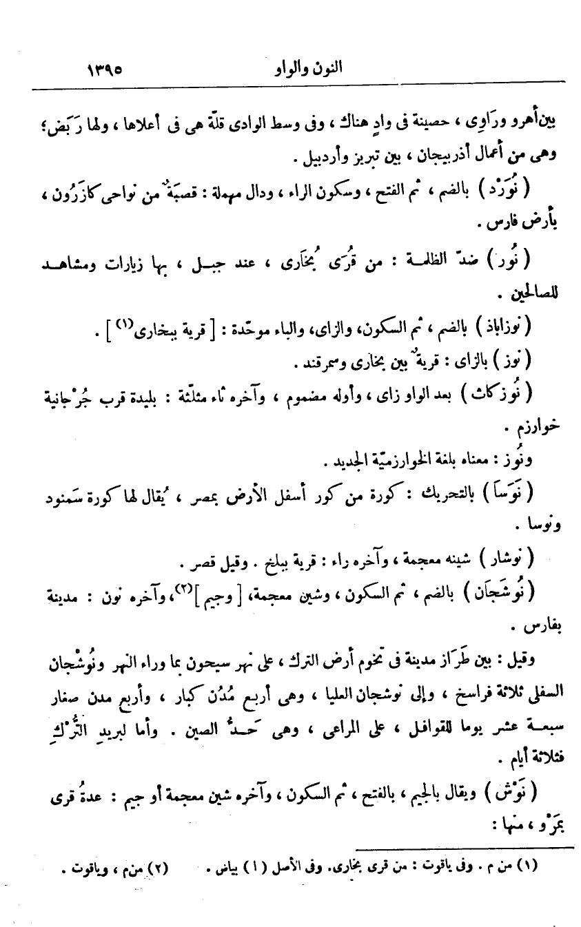 وقيل: بين طراز مدينة فى تخوم أرض الترك، على نهر سيحون بما وراء النهر ونوشجان السفلى ثلاثة فراسخ، وإلى نوشجان العليا، وهى أربع مدن كبار، وأربع مدن صغار سبعة عشر يوما للقوافل، على المراعى، وهى حدّ الصين. وأما لبريد التّرك فثلاثة أيام.