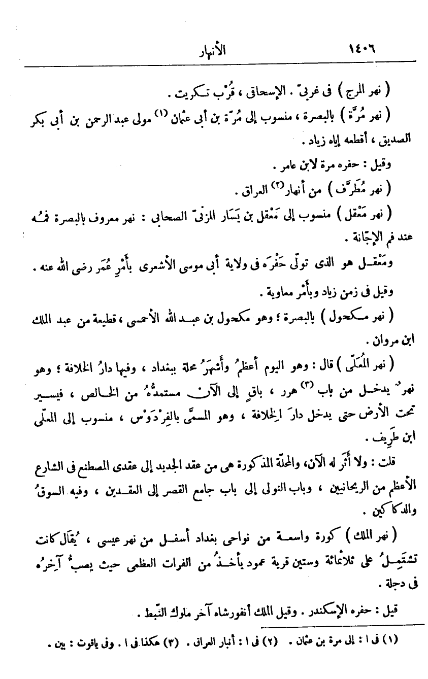 قال: وهو اليوم أعظم وأشهر محلة ببغداد، وفيها دار الخلافة؛ وهو نهر يدخل من باب «3» هرر، باق إلى الآن مستمدّة من الخالص، فيسير تحت الأرض حتى يدخل دار الخلافة، وهو المسمّى بالفردوس، منسوب إلى المعلّى ابن طريف.