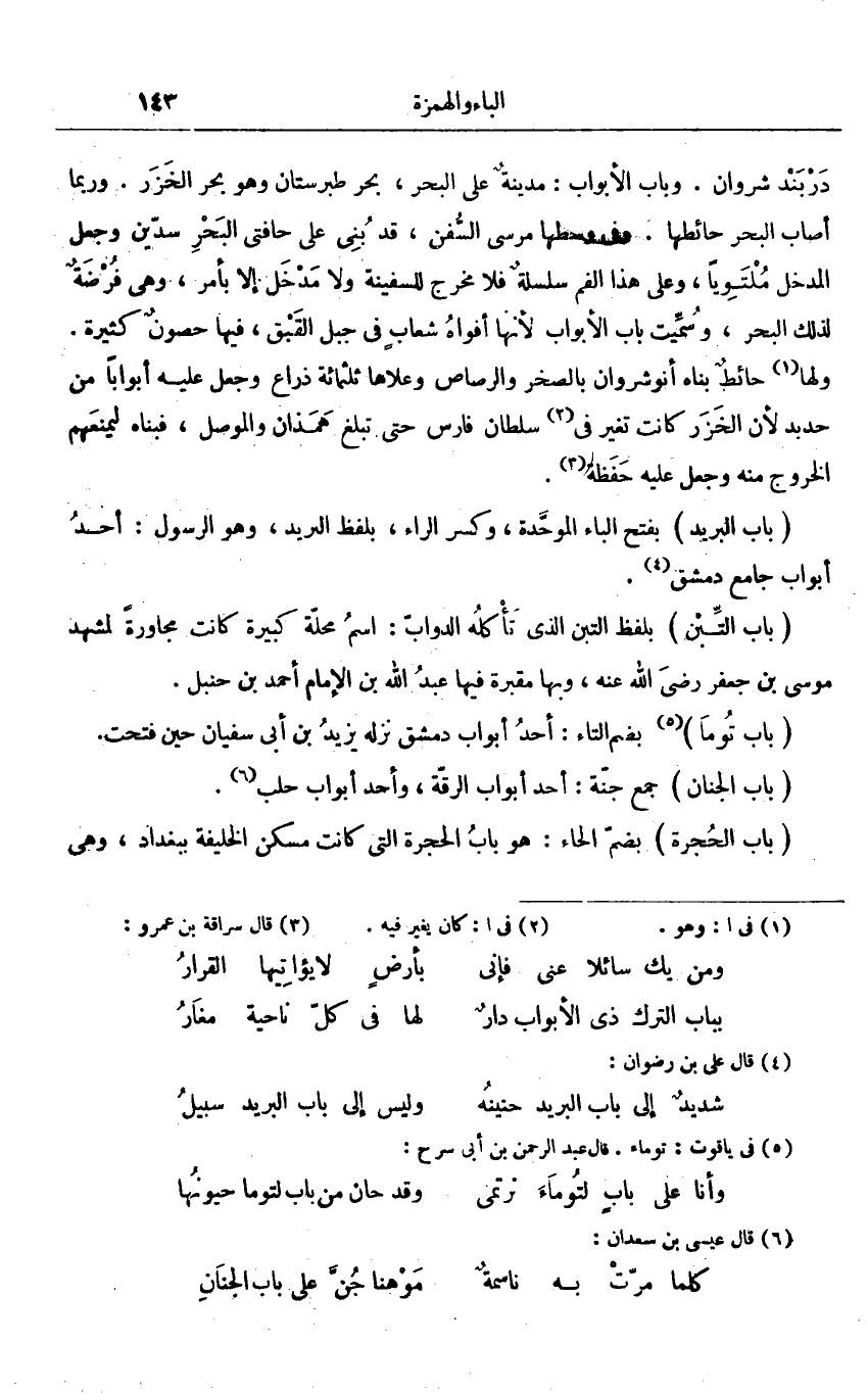 دربند شروان. وباب الأبواب: مدينة على البحر، بحر طبرستان وهو بحر الخزر. وربما أصاب البحر حائطها. وفى وسطها مرسى السّفن، قد بنى على حافتى البحر سدّين وجعل المدخل ملتويا، وعلى هذا الفم سلسلة فلا مخرج للسفينة ولا مدخل إلا بأمر، وهى فرضة لذلك البحر، وسمّيت باب الأبواب لأنها أفواه شعاب فى جبل القبق، فيها حصون كثيرة.