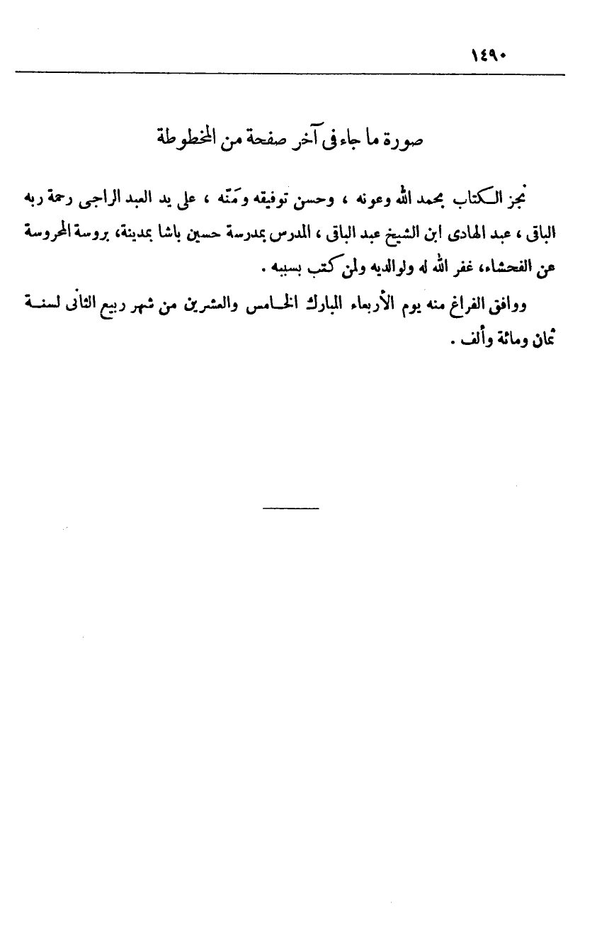 نجز الكتاب بحمد الله وعونه، وحسن توفيقه ومنّه، على يد العبد الراجى رحمة ربه الباقى، عبد الهادى ابن الشيخ عبد الباقى، المدرس بمدرسة حسين باشا بمدينة، بروسة المحروسة عن الفحشاء، غفر الله له ولوالديه ولمن كتب بسببه.