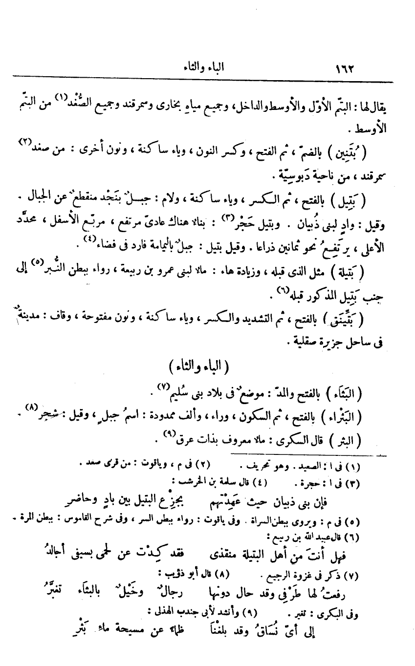 وقيل: واد لبنى ذبيان. وبتيل حجر «3» : بناء هناك عادىّ مرتفع، مربّع الأسفل، محدّد الأعلى، يرتفع نحو ثمانين ذراعا. وقيل بتيل: جبل باليمامة فارد فى فضاء «4» .