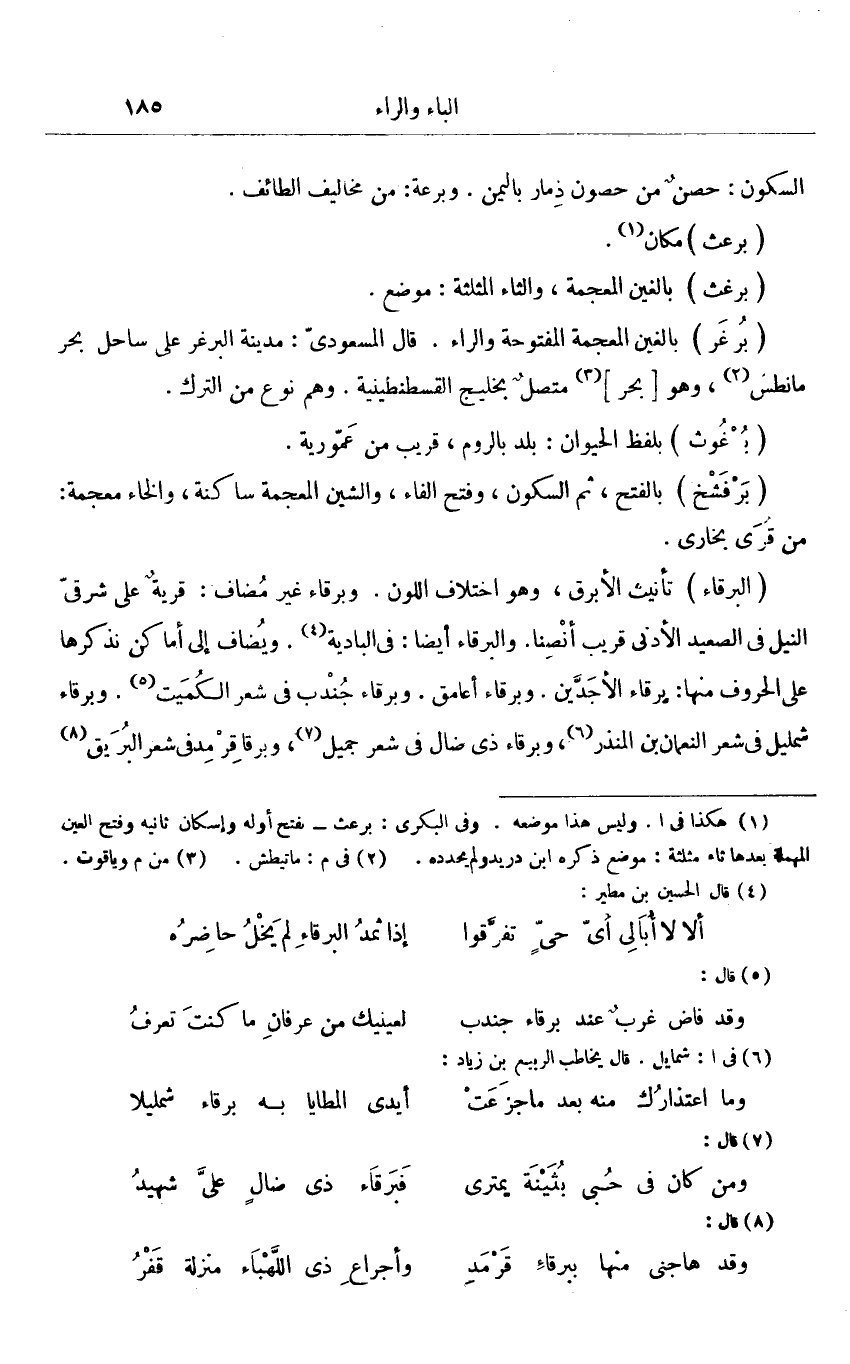 تأنيث الأبرق، وهو اختلاف اللون. وبرقاء غير مضاف: قرية على شرقى النيل فى الصعيد الأدنى قريب أنصنا. والبرقاء أيضا: فى البادية «4» . ويضاف إلى أماكن نذكرها على الحروف منها: برقاء الأجدّين. وبرقاء أعامق. وبرقاء جندب فى شعر الكميت «5» . وبرقاء شمليل فى شعر النعمان بن المنذر «6» ، وبرقاء ذى ضال فى شعر جميل «7» ، وبرقا قرمد فى شعر البريق «8»