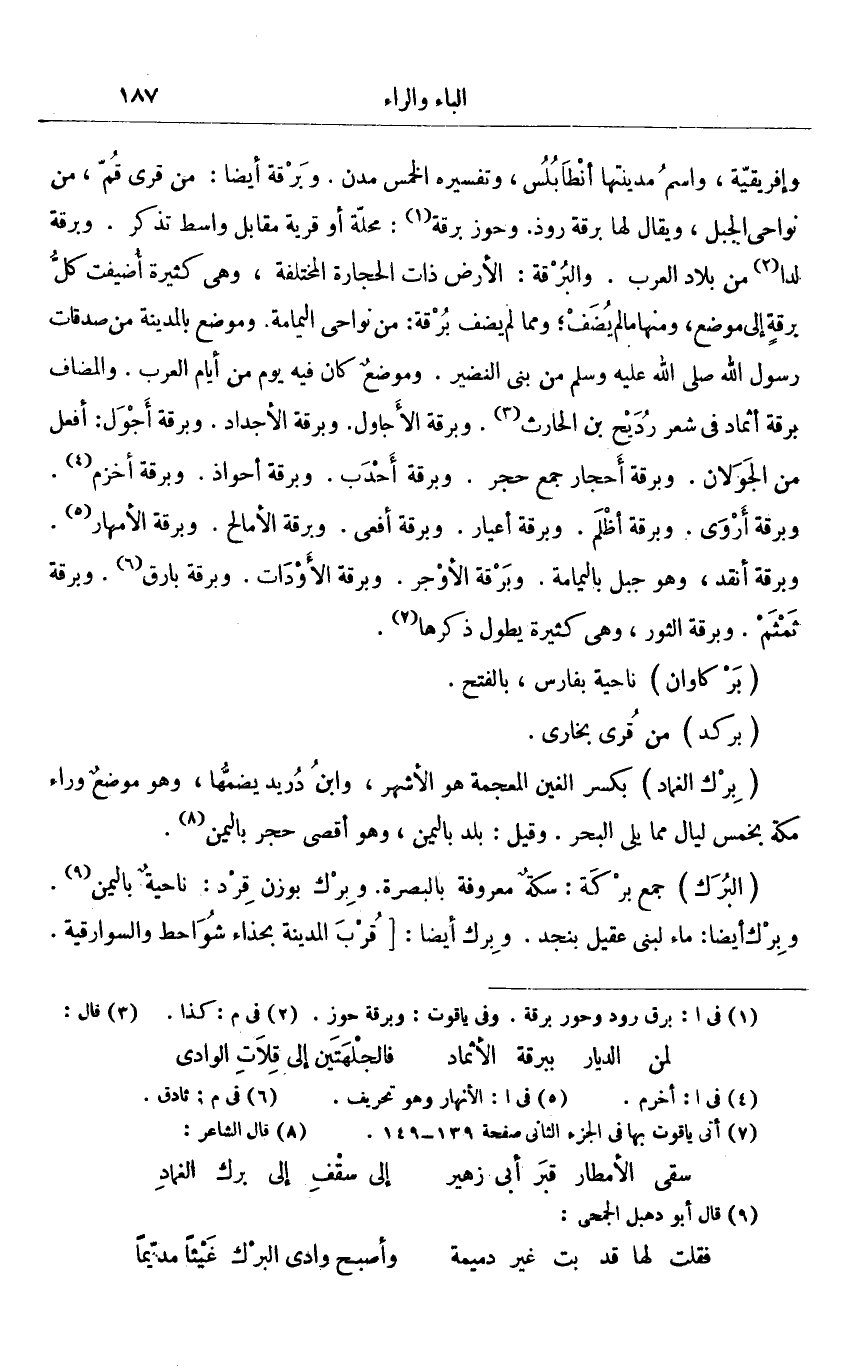 وإفريقيّة، واسم مدينتها أنطابلس، وتفسيره الخمس مدن. وبرقة أيضا: من قرى قمّ، من نواحى الجبل، ويقال لها برقة روذ. وحوز برقة «1» : محلّة أو قرية مقابل واسط تذكر. وبرقة لدا «2» من بلاد العرب. والبرقة: الأرض ذات الحجارة المختلفة، وهى كثيرة أضيفت كلّ برقة إلى موضع، ومنها ما لم يضف؛ ومما لم يضف برقة: من نواحى اليمامة. وموضع بالمدينة من صدقات رسول الله صلى الله عليه وسلم من بنى النضير. وموضع كان فيه يوم من أيام العرب. والمضاف برقة أثماد فى شعر رديح بن الحارث «3» . وبرقة الأجاول. وبرقة الأجداد. وبرقة أجول: أفعل من الجولان. وبرقة أحجار جمع حجر. وبرقة أحدب. وبرقة أحواذ. وبرقة أخزم «4» .