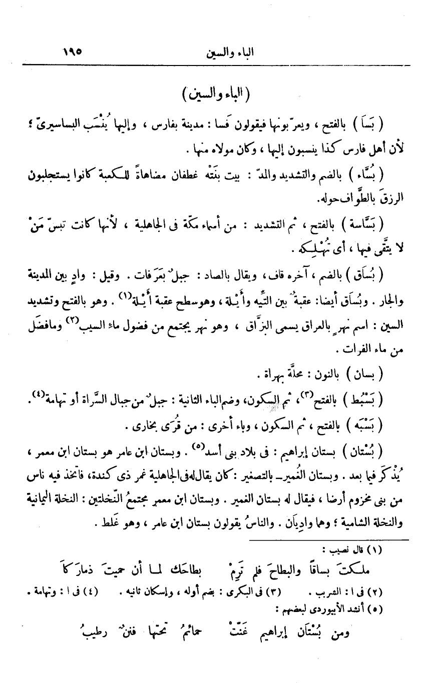 بستان إبراهيم: فى بلاد بنى أسد «5» . وبستان ابن عامر هو بستان ابن معمر، يذكر فيما بعد. وبستان الغمير- بالتصغير: كان يقال له فى الجاهلية غمر ذى كندة، فاتخذ فيه ناس من بنى مخزوم أرضا، فيقال له بستان الغمير. وبستان ابن معمر مجتمع النّخلتين: النخلة اليمانية والنخلة الشامية؛ وهما واديان. والناس يقولون بستان ابن عامر، وهو غلط.