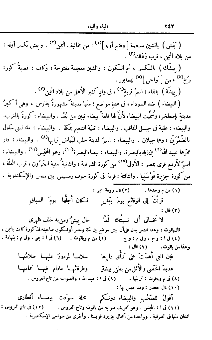 والبيضاء: عقبة فى جبل المناقب. والبيضاء: ثنيّة التنعيم بمكة. والبيضاء: ماء لبنى سلول بالضّمرين، وهما جبلان. والبيضاء: اسم لمدينة حلب لبياض ترابها «8» . والبيضاء: دار عمّرها عبيد الله «9» بن زياد بالبصرة. والبيضاء: بيضاء البصرة «10» ، وهو المخيّس «11» . والبيضاء: