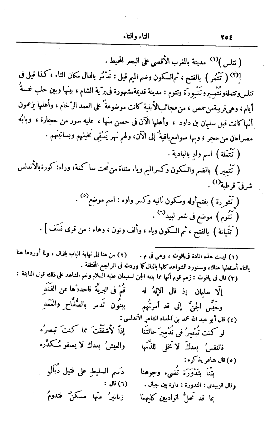 بالفتح، ثم السكون وضم الميم قيل: تدمر بالدال مكان التاء، كذا قيل فى تتلس وتتملة وتتمير وتتورة وتتوم: مدينة قديمة مشهورة فى برّية الشام، بينها وبين حلب خمسة أيام، وهى قريبة من حمص، من عجائب الأبنية كانت موضوعة على العمد الرّخام، وأهلها يزعمون أنها كانت قبل سليمان بن داود، وأهلها الآن فى حصن منها، عليه سور من حجارة، وبابه مصراعان من حجر، وبها صوامع باقية إلى الآن، ولهم نهر يسقى نخيلهم وبساتينهم. «3»