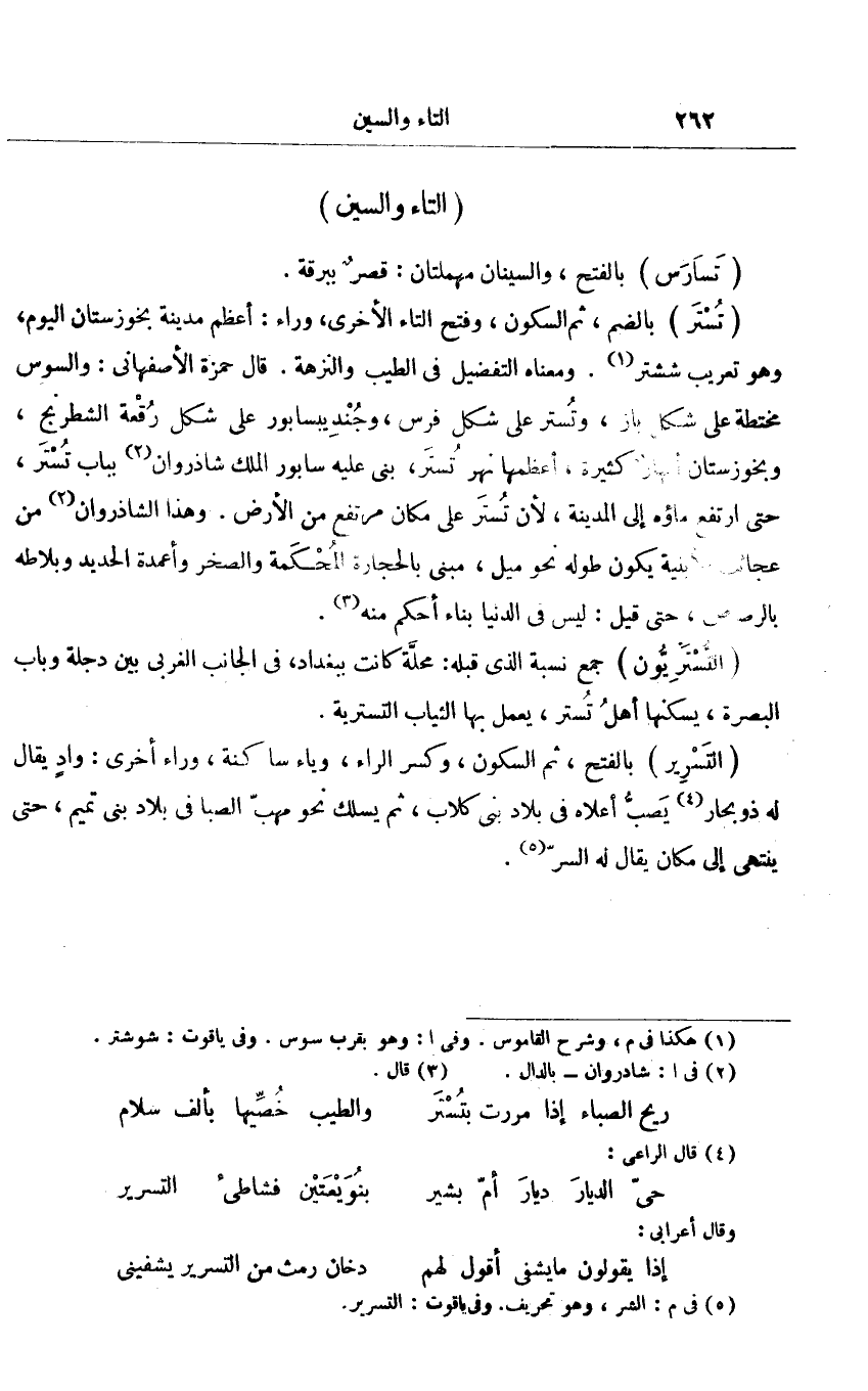 بالضم، ثم السكون، وفتح التاء الأخرى، وراء: أعظم مدينة بخوزستان اليوم، وهو تعريب ششتر «1» . ومعناه التفضيل فى الطيب والنزهة. قال حمزة الأصفهانى: والسوس مختطة على شكل باز، وتستر على شكل فرس، وجنديسابور على شكل رقعة الشطرنج، وبخوزستان أنهار كثيرة، أعظمها نهر تستر، بنى عليه سابور الملك شاذروان «2» بباب تستر، حتى ارتفع ماؤه إلى المدينة، لأن تستر على مكان مرتفع من الأرض. وهذا الشاذروان «3» من عجائب الأبنية يكون طوله نحو ميل، مبنى بالحجارة المحكمة والصخر وأعمدة الحديد وبلاطه بالرصاص، حتى قيل: ليس فى الدنيا بناء أحكم منه «4» .