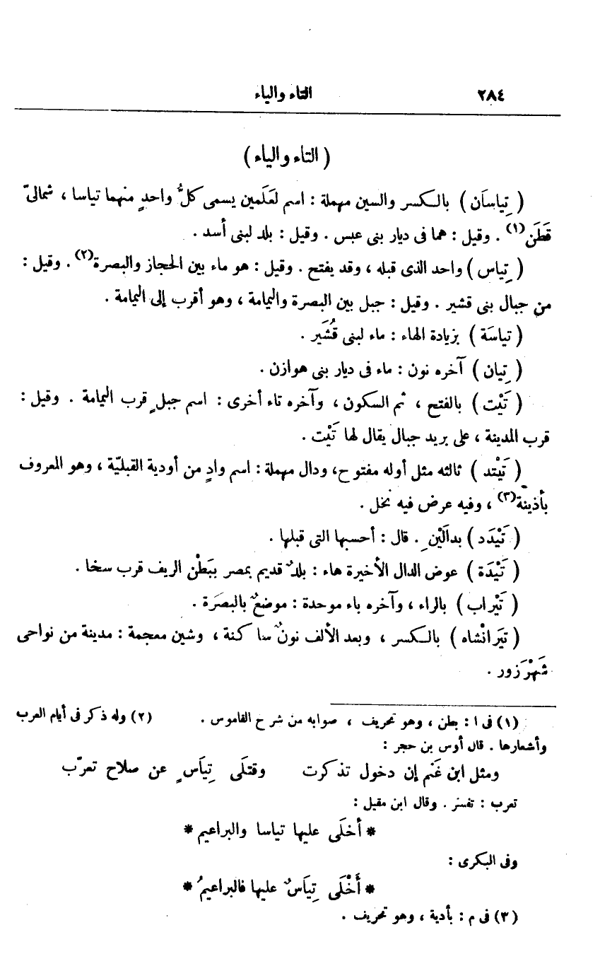 بالكسر والسين مهملة: اسم لعلمين يسمى كلّ واحد منهما تياسا، شمالىّ قطن «1» . وقيل: هما فى ديار بنى عبس. وقيل: بلد لبنى أسد.