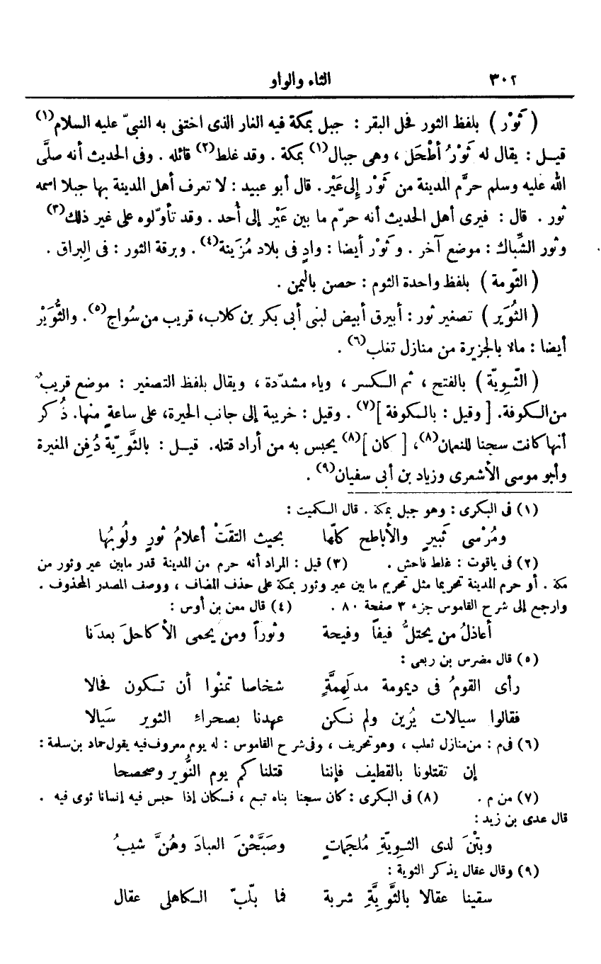 بلفظ الثور فحل البقر: جبل بمكة فيه الغار الذي اختفى به النّبيّ عليه السلام «1» قيل: يقال له ثور أطحل، وهى جبال «2» بمكة. وقد غلط «3» قائله. وفى الحديث أنه صلّى الله عليه وسلم حرّم المدينة من ثور إلى عير. قال أبو عبيد: لا تعرف أهل المدينة بها جبلا اسمه ثور. قال: فيرى أهل الحديث أنه حرّم ما بين عير إلى أحد. وقد تأوّلوه على غير ذلك «4» .