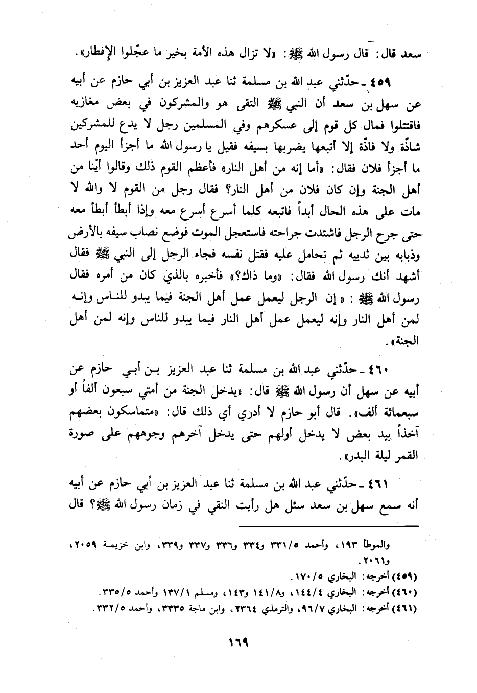 459 - حَدَّثَنِي عَبْدُ اللَّهِ بْنُ مَسْلَمَةَ، ثَنَا عَبْدُ الْعَزِيزِ بْنُ أَبِي حَازِمٍ، عَنْ أَبِيهِ، عَنْ سَهْلِ بْنِ سَعْدٍ: أَنَّ النَّبِيَّ صَلَّى اللهُ عَلَيْهِ وَسَلَّمَ الْتَقَى هُوَ وَْالْمُشْرِكُونَ فِي بَعْضِ مَغَازِيهِ، فَاقْتَتَلُوا، فَمَالَ كُلُّ قَوْمٍ إِلَى عَسْكَرِهِمْ، وَفِي الْمُسْلِمِينَ رَجُلٌ لَا يَدَعُ لِلْمُشْرِكِينَ شَاذَّةً وَلَا فَاذَّةً إِلَّا اتَّبَعَهَا يَضْرِبُهَا بِسَيْفِهِ، فَقِيلَ: يَا رَسُولَ اللَّهِ، مَا أَجْزَأَ الْيَوْمَ أَحَدٌ مَا أَجْزَأَ فُلَانٌ فَقَالَ: أَمَا إِنَّهُ مِنْ أَهْلِ النَّارِ. فَأَعْظَمَ الْقَوْمُ ذَلِكَ، وَقَالُوا: أَيُّنَا مِنْ أَهْلِ الْجَنَّةِ، وَإِنْ كَانَ فُلَانٌ مِنْ أَهْلِ النَّارِ؟ فَقَالَ رَجُلٌ مِنَ الْقَوْمِ: لَا وَاللَّهِ، لَا مَاتَ عَلَى هَذِهِ الْحَالِ أَبَدًا، فَاتَّبَعَهُ كُلَّمَا أَسْرَعَ أَسْرَعَ مَعَهُ، وَإِذَا أَبْطَأَ أَبْطَأَ مَعَهُ، حَتَّى جُرِحَ الرَّجُلُ، فَاشْتَدَّتْ جِرَاحَتُهُ، فَاسْتَعْجَلَ الْمَوْتَ، فَوَضَعَ نِصَابَ سَيْفِهِ بِالْأَرْضِ وَذُبَابَهُ بَيْنَ ثَدْيَيْهِ، ثُمَّ تَحَامَلَ عَلَيْهِ، فَقَتَلَ نَفْسَهُ، فَجَاءَ الرَّجُلُ إِلَى النَّبِيِّ صَلَّى اللهُ عَلَيْهِ وَسَلَّمَ، فَقَالَ: أَشْهَدُ أَنَّكَ رَسُولُ اللَّهِ، فَقَالَ: وَمَا ذَاكَ؟ فَأَخْبَرَهُ بِالَّذِي كَانَ مِنْ أَمْرِهِ، فَقَالَ رَسُولُ اللَّهِ صَلَّى اللهُ عَلَيْهِ وَسَلَّمَ: «إِنَّ §الرَّجُلَ لَيَعْمَلُ عَمَلَ أَهْلِ الْجَنَّةِ فِيمَا يَبْدُو لِلنَّاسِ، وَإِنَّهُ لَمِنْ أَهْلِ النَّارِ، وَإِنَّهُ لَيَعْمَلُ عَمَلَ أَهْلِ النَّارِ فِيمَا يَبْدُو لِلنَّاسِ، وَإِنَّهُ لَمِنْ أَهْلِ الْجَنَّةِ»