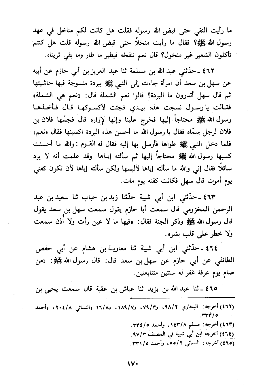 463 - حَدَّثَنِي ابْنُ أَبِي شَيْبَةَ، حَدَّثَنَا زَيْدُ بْنُ حُبَابٍ، ثَنَا سَعِيدُ بْنُ عَبْدِ الرَّحْمَنِ الْمَخْزُومِيُّ، قَالَ: سَمِعْتُ أَبَا حَازِمٍ، يَقُولُ: سَمِعْتُ سَهْلَ بْنَ سَعْدٍ، يَقُولُ: قَالَ رَسُولُ اللَّهِ صَلَّى اللهُ عَلَيْهِ وَسَلَّمَ وَذَكَرَ الْجَنَّةَ، فَقَالَ: «§فِيهَا مَا لَا عَيْنٌ رَأَتْ، وَلَا أُذُنٌ سَمِعَتْ، وَلَا خَطَرَ عَلَى قَلْبِ بَشَرٍ»