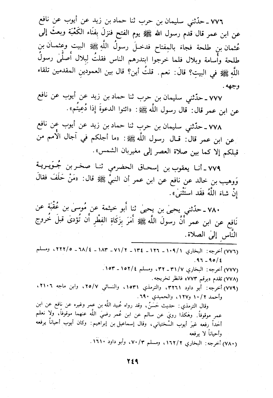 777 - حَدَّثَنِي سُلَيْمَانُ بْنُ حَرْبٍ، ثَنَا حَمَّادُ بْنُ زَيْدٍ، عَنْ أَيُّوبَ، عَنْ نَافِعٍ، عَنِ ابْنِ عُمَرَ قَالَ: قَالَ رَسُولُ اللَّهِ صَلَّى اللهُ عَلَيْهِ وَسَلَّمَ: «§ائْتُوا الدَّعْوَةَ إِذَا دُعِيتُمْ»