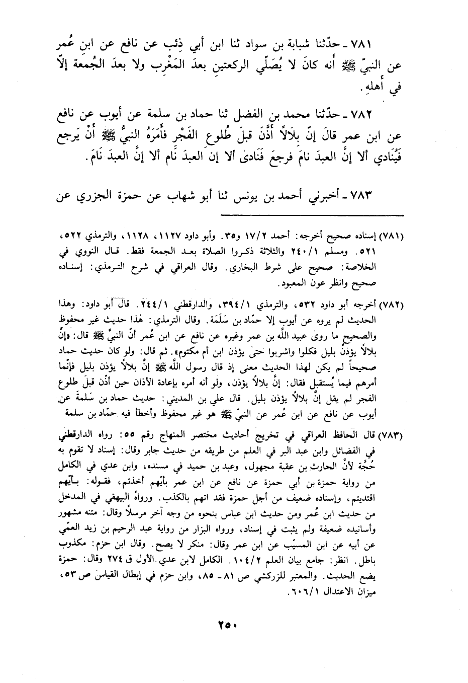 782 - حَدَّثَنَا مُحَمَّدُ بْنُ الْفَضْلِ، ثَنَا حَمَّادُ بْنُ سَلَمَةَ، عَنْ أَيُّوبَ، عَنْ نَافِعٍ، عَنِ ابْنِ عُمَرَ قَالَ: «إِنَّ بِلَالًا أَذَّنَ قَبْلَ طُلُوعِ الْفَجْرِ §فَأَمَرَهُ النَّبِيُّ صَلَّى اللهُ عَلَيْهِ وَسَلَّمَ أَنْ يَرْجِعَ فَيُنَادِيَ أَلَا إِنَّ الْعَبْدَ نَامَ فَرَجَعَ فَنَادَى أَلَا إِنَّ الْعَبْدَ نَامَ أَلَا إِنَّ الْعَبْدَ نَامَ»