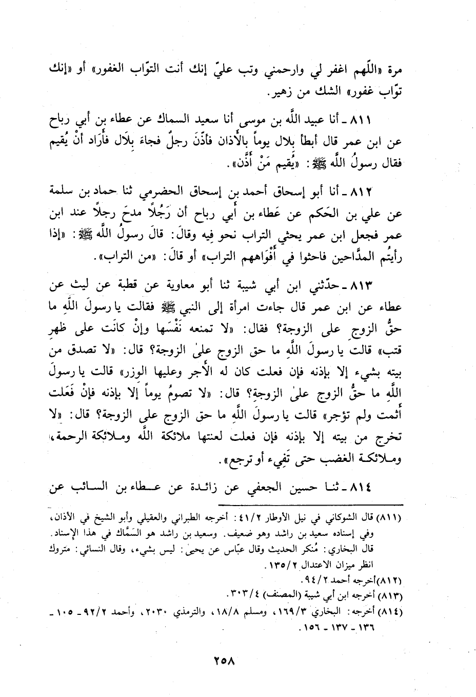 813 - حَدَّثَنِي ابْنُ أَبِي شَيْبَةَ، ثَنَا أَبُو مُعَاوِيَةَ، عَنْ قُطْبَةَ، عَنْ لَيْثٍ، عَنْ عَطَاءٍ، عَنِ ابْنِ عُمَرَ قَالَ: جَاءَتِ امْرَأَةٌ إِلَى النَّبِيِّ صَلَّى اللهُ عَلَيْهِ وَسَلَّمَ، فَقَالَتْ: يَا رَسُولَ اللَّهِ، مَا حَقُّ الزَّوْجِ عَلَى الزَّوْجَةِ؟ فَقَالَ: لَا تَمْنَعُهُ نَفْسَهَا وَإِنْ كَانَتْ عَلَى ظَهْرِ قَتَبٍ. قَالَتْ: يَا رَسُولَ اللَّهِ، مَا حَقُّ الزَّوْجِ عَلَى الزَّوْجَةِ؟ قَالَ: لَا تَصَدَّقُ مِنْ بَيْتِهِ بِشَيْءٍ إِلَّا بِإِذْنِهِ فَإِنْ فَعَلَتْ كَانَ لَهُ الْأَجْرُ وَعَلَيْهَا الْوِزْرُ. قَالَتْ: يَا رَسُولَ اللَّهِ، مَا حَقُّ الزَّوجِ عَلَى الزَّوْجَةِ؟ قَالَ: لَا تَصُومُ يَوْمًا إِلَّا بِإِذْنِهِ فَإِنْ فَعَلَتْ أَثِمَتْ وَلَمْ تُؤْجَرْ. قَالَتْ: يَا رَسُولَ اللَّهِ، مَا حَقُّ الزَّوْجِ عَلَى الزَّوْجَةِ؟ قَالَ: «§لَا تَخْرُجُ مِنْ بَيْتِهِ إِلَّا بِإِذْنِهِ فَإِنْ فَعَلَتْ لَعَنَتْهَا مَلَائِكَةُ اللَّهِ وَمَلَائِكَةُ الرَّحْمَةِ وَمَلَائِكَةُ الْغَضَبِ حَتَّى تَفِيءَ أَوْ تَرْجِعَ»