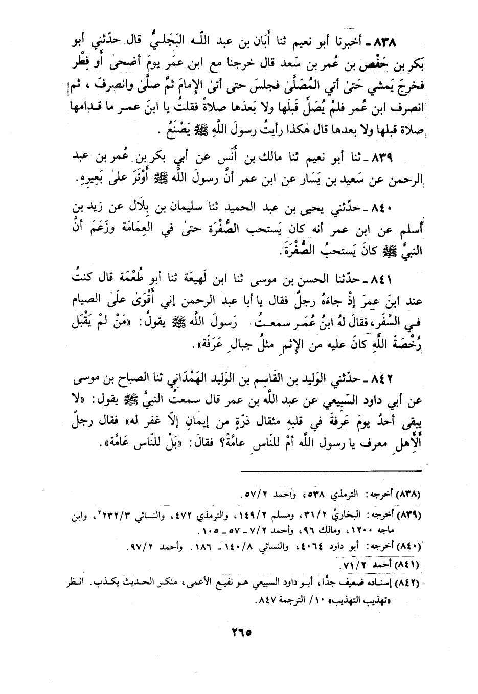 841 - حَدَّثَنَا الْحَسَنُ بْنُ مُوسَى، ثَنَا ابْنُ لَهِيعَةَ، ثَنَا أَبُو طُعْمَةَ قَالَ: كُنْتُ عِنْدَ ابْنِ عُمَرَ إِذْ جَاءَهُ رَجُلٌ، فَقَالَ: يَا أَبَا عَبْدِ الرَّحْمَنِ إِنِّي أَقْوَى عَلَى الصِّيَامِ فِي السَّفَرِ فَقَالَ لَهُ ابْنُ عُمَرَ: سَمِعْتُ رَسُولَ اللَّهِ صَلَّى اللهُ عَلَيْهِ وَسَلَّمَ، يَقُولُ: «§مَنْ لَمْ يَقْبَلْ رُخْصَةَ اللَّهِ كَانَ عَلَيْهِ مِنَ الْإِثْمِ مِثْلُ جِبَالِ عَرَفَةَ»