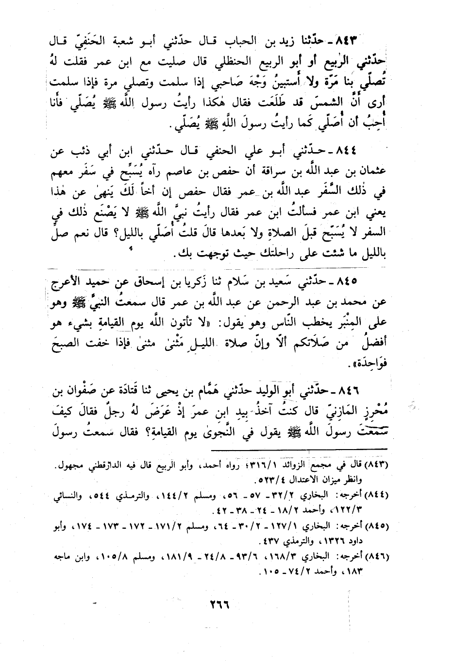 843 - حَدَّثَنَا زَيْدُ بْنُ الْحُبَابِ قَالَ: حَدَّثَنِي أَبُو شُعْبَةَ الْحَنَفِيُّ قَالَ: حَدَّثَنِي الرَّبِيعُ، أَوْ أَبُو الرَّبِيعِ الْحَنْظَلِيُّ قَالَ: صَلَّيْتُ مَعَ ابْنِ عُمَرَ، فَقُلْتُ لَهُ: تُصَلِّي بِنَا مَرَّةً وَلَا أَسْتَبِينُ وَجْهَ صَاحِبِي إِذَا سَلَّمْتَ وَتُصَلِّي مَرَّةً، فَإِذَا سَلَّمْتَ أَرَى أَنَّ الشَّمْسَ قَدْ طَلَعَتْ، فَقَالَ: «§هَكَذَا رَأَيْتُ رَسُولَ اللَّهِ صَلَّى اللهُ عَلَيْهِ وَسَلَّمَ يُصَلِّي فَأَنَا أُحِبُّ أَنْ أُصَلِّيَ كَمَا رَأَيْتُ رَسُولَ اللَّهِ صَلَّى اللهُ عَلَيْهِ وَسَلَّمَ يُصَلِّي»