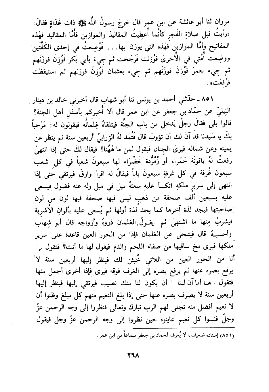 851 - حَدَّثَنِي أَحْمَدُ بْنُ يُونُسَ ثَنَا أَبُو شِهَابٍ قَالَ: أَخْبَرَنِي خَالِدُ بْنُ دِينَارٍ النِّيلِيُّ، عَنْ حَمَّادِ بْنِ جَعْفَرٍ، عَنِ ابْنِ عُمَرَ قَالَ: أَلَا أُخْبِرُكُمْ بِأَسْفَلِ أَهْلِ الْجَنَّةِ؟ قَالُوا: بَلَى، فَقَالَ: " §رَجُلٌ يَدْخُلُ مِنْ بَابِ الْجَنَّةِ فَيَتَلَقَّاهُ غِلْمَانُهُ فَيَقُولُونَ لَهُ: مَرْحَبًا بِكَ يَا سَيِّدَنَا قَدْ آنَ لَكَ أَنْ تَئُوبَ. قَالَ: فَتُمَدُّ لَهُ الزَّرَابِيُّ أَرْبَعِينَ سَنَةً، ثُمَّ يَنْظُرُ عَنْ يَمِينِهِ وَعَنْ شِمَالِهِ فَيَرَى الْجِنَانَ فَيَقُولُ: لِمَنْ مَا هَاهُنَا؟ فَيُقَالَ: لَكَ. حَتَّى إِذَا انْتَهَى رُفِعَتْ لَهُ يَاقُوتَةٌ حَمْرَاءُ أَوْ زُمُرُّدَةٌ خَضْرَاءُ لَهَا سَبْعُونَ شِعْبًا فِي كُلِّ شِعْبٍ سَبْعُونَ غُرْفَةً فِي كُلِّ غُرْفَةٍ سَبْعُونَ بَابًا فَيُقَالَ لَهُ: اقْرَأْ وَارْقَ فَيَرْتَقِي حَتَّى إِذَا انْتَهَى إِلَى سَرِيرِ مُلْكِهِ اتَّكَأَ عَلَيْهِ، سَعَتُهُ مِيلُ فِي مِيلٍ وَلَهُ عَنْهُ فُضُولٌ، فَيَسْعَى عَلَيْهِ بِسَبْعِينَ أَلْفَ صَحْفَةٍ مِنْ ذَهَبٍ لَيْسَ فِيهَا صَحْفَةٌ فِيهَا لَوْنٌ مِنْ لَوْنِ صَاحِبَتِهَا، فَيَجِدُ لَذَّةَ آخِرِهَا كَمَا يَجِدُ لَذَّةَ أَوَّلِهَا، ثُمَّ يُسْعَى عَلَيْهِ بِأَلْوَانِ الْأَشْرِبَةِ فَيَشْرَبُ مِنْهَا مَا اشْتَهَى، ثُمَّ يَقُولُ الْغِلْمَانُ: ذَرُوهُ وَأزْوَاجَهُ " قَالَ أَبُو شِهَابٍ: وَأَحْسُبُهُ قَالَ: فَيَتَنَحَّى عَنِ الْغِلْمَانِ فَإِذَا مِنَ الْحُورِ الْعِينِ قَاعِدَةٌ عَلَى سَرِيرِ مُلْكِهَا فَيَرَى مُخَّ سَاقَيْهَا مِنْ صَفَاءِ اللَّحْمِ وَالدَّمِ فَيَقُولُ لَهَا: مَا أَنْتَ؟ فَتَقُولُ: أَنَا مِنَ الْحُورِ الْعِينِ مِنَ اللَّاتِي خُبِّئْنَ لَكَ فَيَنْظُرُ إِلَيْهَا أَرْبَعِينَ سَنَةً لَا يَرْفَعُ بَصَرَهُ عَنْهَا ثُمَّ يَرْفَعُ بَصَرَهُ إِلَى الْغُرَفِ فَوْقَهُ فَيَرَى فَإِذَا أُخْرَى أَجْمَلُ مِنْهَا فَتَقُولَ: هَا أَمَا آنَ لَنَا أَنْ يَكُونَ لَنَا مِنْكَ نَصِيبٌ فَيَرْتَقِي إِلَيْهَا فَيَنْظُرُ إِلَيْهَا أَرْبَعِينَ سَنَةً لَا يَصْرِفُ بَصَرَهُ عَنْهَا حَتَّى إِذَا بَلَغَ النَّعِيمُ مِنْهُمْ كُلَّ مَبْلَغٍ وَظَنُّوا أَنْ لَا نَعِيمَ أَفْضَلُ مِنْهُ تَجَلَّى لَهُمُ الرَّبُّ تَبَارَكَ وَتَعَالَى فَنَظَرُوا إِلَى وَجْهِ الرَّحْمَنِ عَزَّ وَجَلَّ فَنَسُوا كُلَّ نَعِيمٍ عَايَنُوهُ حِينَ نَظَرُوا إِلَى وَجْهِ الرَّحْمَنِ عَزَّ وَجَلَّ فَيَقُولُ: يَا أَهْلَ الْجَنَّةِ هَلِّلُونِي فَيَتَجَاوبُونَ بِالتَّهْلِيلِ فَيَقُولُ: يَا دَاوُدُ قُمْ فَمَجِّدْنِي كَمَا كُنْتُ تُمَجِّدُنِي فِي الدُّنْيَا، فَيُمَجِّدُ دَاوُدُ رَبَّهُ عَزَّ وَجَلَّ قَالَ أَحْمَدُ بْنُ يُونُسَ: قُلْتُ لِأَبِي شِهَابٍ: حَدِيثُ خَالِدِ بْنِ دِينَارٍ فِي ذِكْرِ الْجَنَّةِ رَفَعَهُ. قَالَ: نَعَمْ.