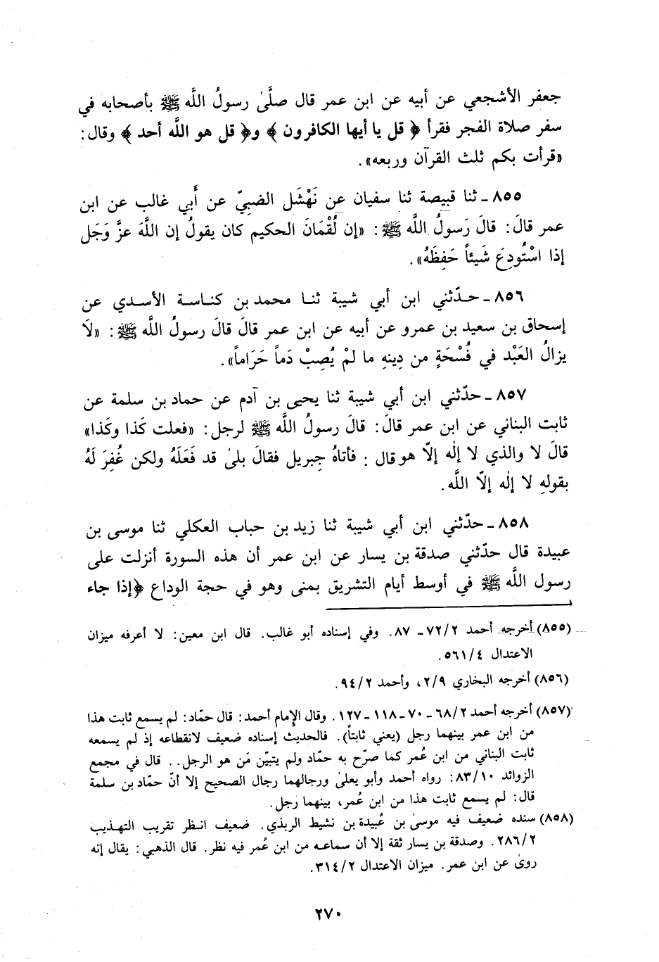 858 - حَدَّثَنِي ابْنُ أَبِي شَيْبَةَ، ثَنَا زَيْدُ بْنُ حُبَابٍ الْعُكْلِيُّ، ثَنَا مُوسَى بْنُ عُبَيْدَةَ قَالَ: حَدَّثَنِي صَدَقَةُ بْنُ يَسَارٍ، عَنِ ابْنِ عُمَرَ: أَنَّ هَذِهِ السُّورَةَ أُنْزِلَتْ عَلَى رَسُولِ اللَّهِ صَلَّى اللهُ عَلَيْهِ وَسَلَّمَ فِي أَوْسَطِ أَيَّامِ التَّشْرِيقِ بِمِنًى وَهُوَ فِي حَجَّةِ الْوَدَاعِ إِذَا جَاءَ نَصْرُ اللَّهِ وَالْفَتْحُ حَتَّى خَتَمَهَا فَعَرَفَ رَسُولُ اللَّهِ صَلَّى اللهُ عَلَيْهِ وَسَلَّمَ أَنَّهُ الْوَدَاعُ، فَأَمَرَ بِرَاحِلَتِهِ الْقَصْوَاءِ فَرُحِلَتْ لَهُ فَرَكِبَ فَوَقَفَ للنَّاسِ بِالْعَقَبَةِ فَاجْتَمَعَ إِلَيْهِ النَّاسُ فَحَمِدَ اللَّهُ، وَأثْنَى عَلَيْهِ بِمَا هُوَ أَهْلُهُ، فَقَالَ: " أَيُّهَا النَّاسُ إِنَّ §كُلَّ دَمٍ كَانَ فِي الْجَاهِلِيَّةِ فَهُوَ هَدَرٌ وَأَوَّلُ دِمَائِكُمْ دَمُ إِيَاسِ بْنِ رَبِيعَةَ بْنِ الْحَارِثِ كَانَ مُسْتَرْضِعًا فِي بَنِي لَيْثٍ فَقَتَلَتْهُ هُذَيْلٌ، وَإِنَّ أَوَّلَ رِبًا كَانَ فِي الْجَاهِلِيَّةِ رِبَا الْعَبَّاسِ بْنِ عَبْدِ الْمُطَّلِبِ فَهُوَ أَوْضَعُ لَكُمْ رُءُوسُ أَمْوَالِكُمْ لَا تَظْلِمُونَ وَلَا تُظْلَمُونَ، أَيُّهَا النَّاسُ، إِنَّ الزَّمَانَ قَدِ اسْتَدَارَ فَهُوَ الْيَوْمَ كَهَيْئَةِ يَوْمِ خَلَقَ اللَّهُ السَّمَاوَاتِ وَالْأَرْضَ وَإِنَّ عِدَّةَ الشُّهُورِ عِنْدَ اللَّهِ اثْنَا عَشَرَ شَهْرًا فِي كِتَابِ اللَّهِ مِنْهَا أَرْبَعَةٌ حُرُمٌ رَجَبُ مُضَرَ بَيْنَ جُمَادَى وَشَعْبَانَ، وَذُو الْقَعْدَةِ، وَذُو الْحِجَّةِ، وَالْمُحَرَّمُ، وَإِنَّ النَّسِيءَ زِيَادَةٌ فِي الْكُفْرِ يُضَلُّ بِهِ الَّذِينَ كَفَرُوا يُحِلُّونَهُ عَامًا وَيُحَرِّمُونَهُ عَامًا لِيُوَاطِئُوا عِدَّةَ مَا حَرَّمَ اللَّهُ وَذَلِكَ أَنَّهُمْ كَانُوا يَجْعَلُونَ صَفَرَ عَامًا حَرَامًا وَعَامًا حَلَالًا، وَيجْعَلُونَ المُحَرَّمَ عَامًا حَلَالًا وَعَامًا حَرَامًا، وَذَلِكَ النَّسِيءُ مِنَ الشَّيْطَانِ يَا أَيُّهَا النَّاسُ إِنَّ الشَّيْطَانَ قَدْ يَئِسَ أَنْ يُعْبَدَ فِي بَلَدِكُمْ هَذَا آخِرَ الزَّمَانِ وَقَدْ رَضِيَ مِنْكُمْ بِمُحَقَّرَاتِ الْأَعْمَالِ فَاحْذَرُوهُ فِي دِينِكُمْ، أَيُّهَا النَّاسُ، مَنْ كَانَتْ عِنْدَهُ وَدِيعَةٌ فَلْيُؤَدِّهَا إِلَى مَنِ ائْتَمَنَهُ عَلَيْهَا، أَيُّهَا النَّاسُ، إِنَّ النِّسَاءَ عِنْدَكُمْ عَوَانٌ، أَخَذْتُمُوهُنَّ بِأَمَانَةِ اللَّهِ، وَاسْتَحْلَلْتُمْ فُرُوجَهُنَّ بِكَلِمَةِ اللَّهِ، وَلَكُمْ عَلَيْهُنَّ حَقٌّ، وَلَهُنَّ عَلَيْكُمْ حَقٌّ، وَمِنْ حَقِّكُمْ أَنْ لَا يُوطِئْنَ فُرُشَكُمْ وَلَا يَعْصِينَكُمْ فِي مَعْرُوفٍ فَإِذَا فَعَلْنَ ذَلِكَ فَلَهُنَّ رِزْقُهُنَّ وَكِسْوَتُهُنَّ بِالْمَعْرُوفِ فَإِذَا ضَرَبْتُمْ فَاضْرِبُوا ضَرْبًا غَيْرَ مُبَرِّحٍ، أَيُّهَا النَّاسُ قَدْ تَرَكْتُ فِيكُمْ مَا إِذَا اعْتَصَمْتُمْ بِهِ لَنْ تَضِلُّوا كِتَابَ اللَّهِ، أَيُّهَا النَّاسُ، أَيُّ يَوْمٍ هَذَا؟ قَالُوا يَوْمٌ حَرَامٌ. قَالَ: أَيُّ شَهْرٍ هَذَا؟ قَالُوا: شَهْرٌ حَرَامٌ. قَالَ: أَيُّ بَلَدٍ هَذَا؟ قَالُوا: بَلَدٌ حَرَامٌ. قَالَ: فَإِنَّ اللَّهَ عَزَّ وَجَلَّ قَدْ حَرَّمَ دِمَاءَكُمْ وَأَمْوَالَكُمْ وَأَعْرَاضَكُمْ كَحُرْمَةِ هَذَا الْيَوْمِ وَهَذَا الشَّهْرِ أَلَا لَا نَبِيَّ بَعْدِي وَلَا أُمَّةَ بَعْدَكُمْ أَلَا فَلْيُبَلِّغْ شَاهِدُكُمْ غَائِبَكُمْ ثُمَّ رَفَعَ يَدَيْهِ فَقَالَ: اللَّهُمَّ اشْهَدْ أَنِّي قَدْ بَلَّغْتُ ثَلَاثَ مِرَارٍ "