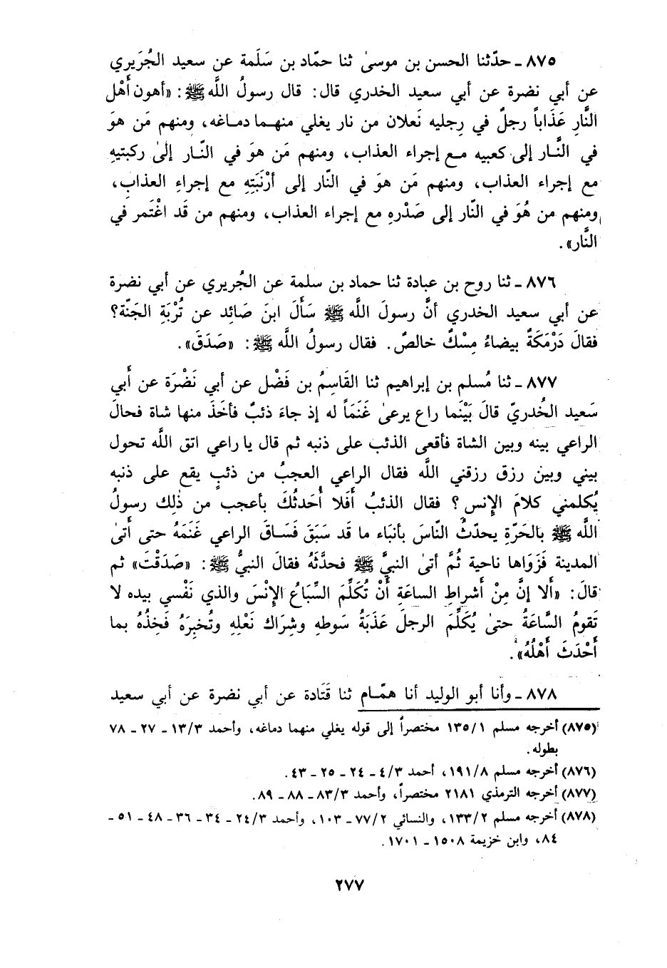 875 - حَدَّثَنَا الْحَسَنُ بْنُ مُوسَى، ثَنَا حَمَّادُ بْنُ سَلَمَةَ، عَنْ سَعِيدٍ الْجُرَيْرِيِّ، عَنْ أَبِي نَضْرَةَ، عَنْ أَبِي سَعِيدٍ الْخُدْرِيِّ قَالَ: قَالَ رَسُولُ اللَّهِ صَلَّى اللهُ عَلَيْهِ وَسَلَّمَ: «§أَهْوَنُ أَهْلِ النَّارِ عَذَابًا رَجُلٌ فِي رِجْلَيْهِ نَعْلَانِ مِنْ نَارٍ يَغْلِي مِنْهُمَا دِمَاغُهُ، وَمِنْهُمْ مَنْ هُوَ فِي النَّارِ إِلَى كَعْبَيْهِ مَعَ إِجْرَاءِ الْعَذَابِ وَمِنْهُمْ مَنْ هُوَ فِي النَّارِ إِلَى رُكْبَتَيْهِ مَعَ إِجْرَاءِ الْعَذَابِ وَمِنْهُمْ مَنْ هُوَ فِي النَّارِ إِلَى أَرْنَبَتِهِ مَعَ إِجْرَاءِ الْعَذَابِ وَمِنْهُمْ مَنْ هُوَ فِي النَّارِ إِلَى صَدْرِهِ مَعَ إِجْرَاءِ الْعَذَابِ وَمِنْهُمْ مَنْ قَدِ اغْتَمَرَ فِي النَّارِ»